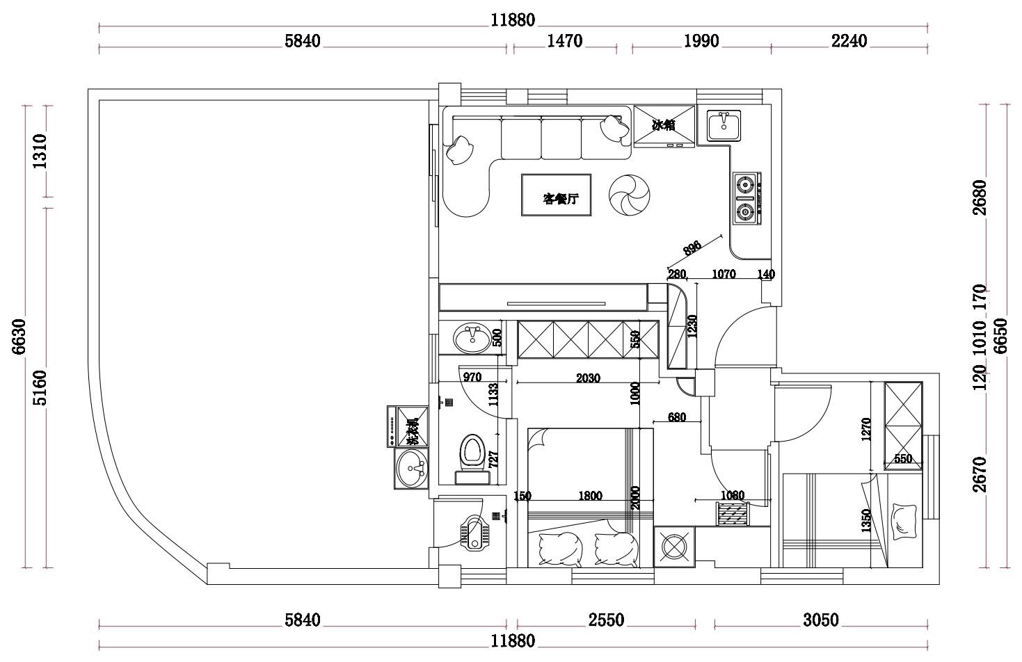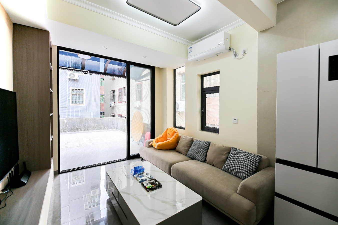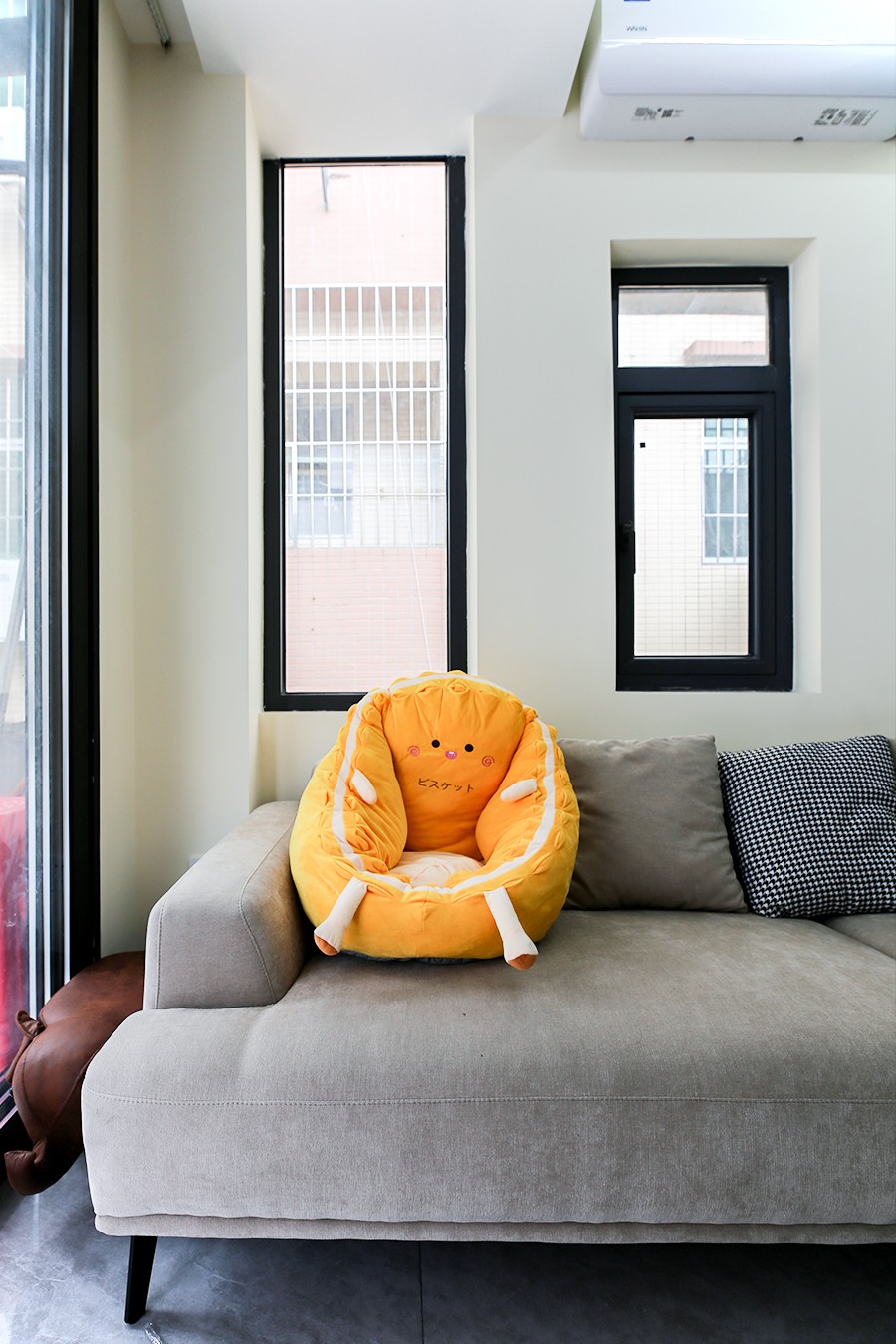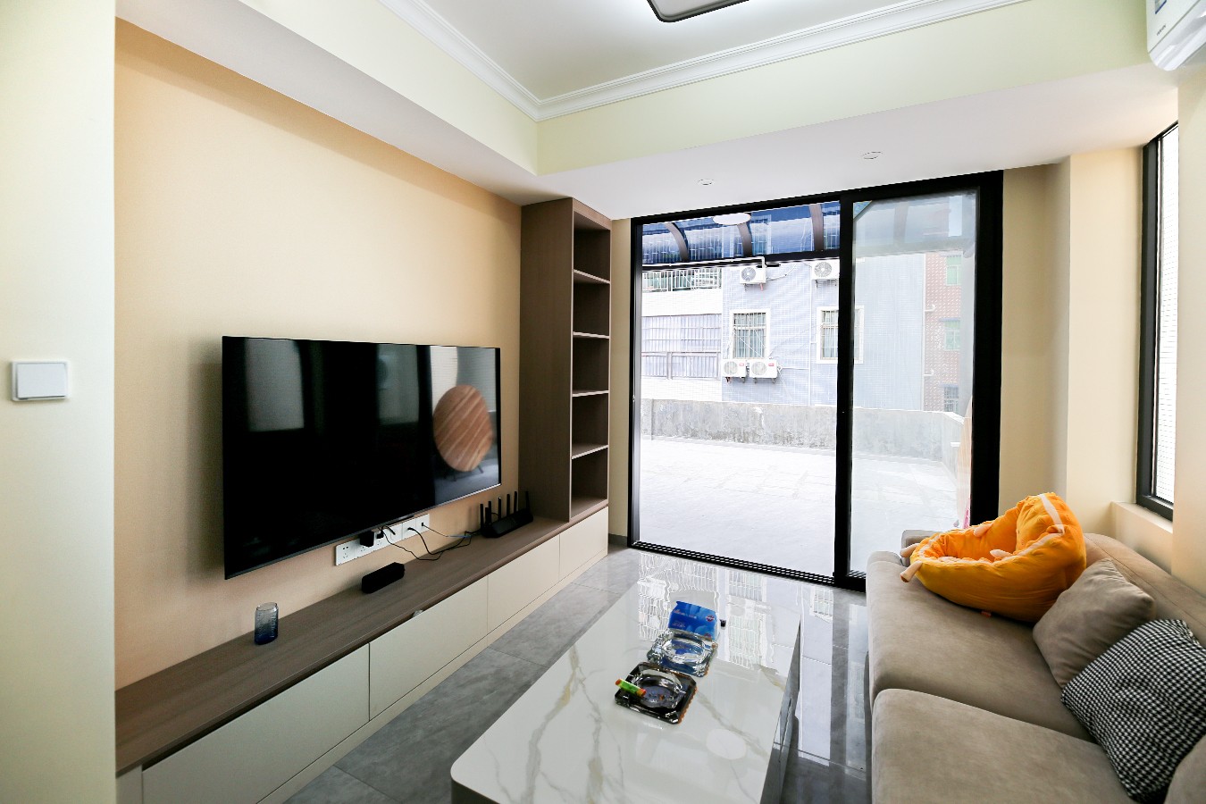 客厅与厨房两盏吸顶灯设计显得干净利落,电视背景墙涂刷淡黄色墙漆,不会显得单调,电视柜做了地柜和置物格满足基础收纳。