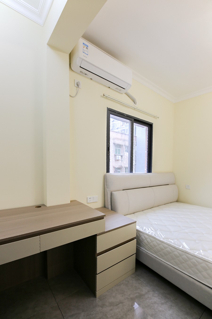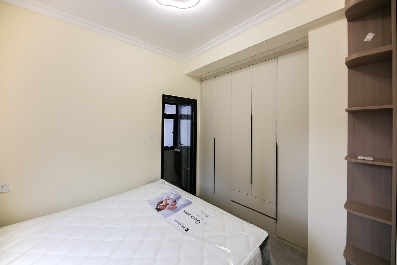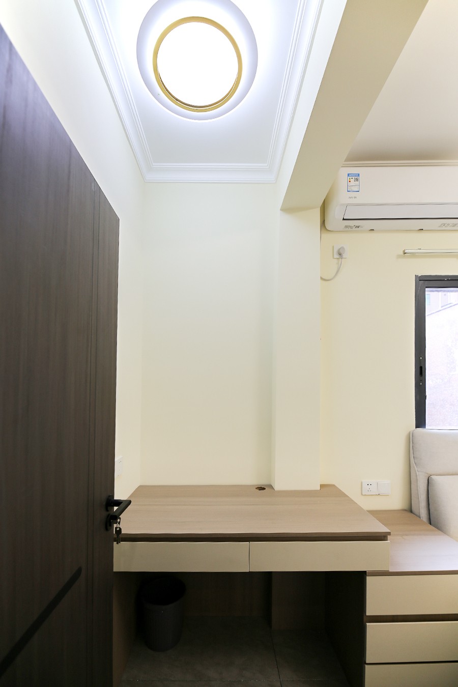 主卧延续了客厅的基调,浅黄色+白色的搭配,进门书桌+床头柜的组合,床尾靠墙定制的到顶衣柜,氛围灯带提升室内的情调,设计简约而质感,在视觉上营造出恬静温暖感。