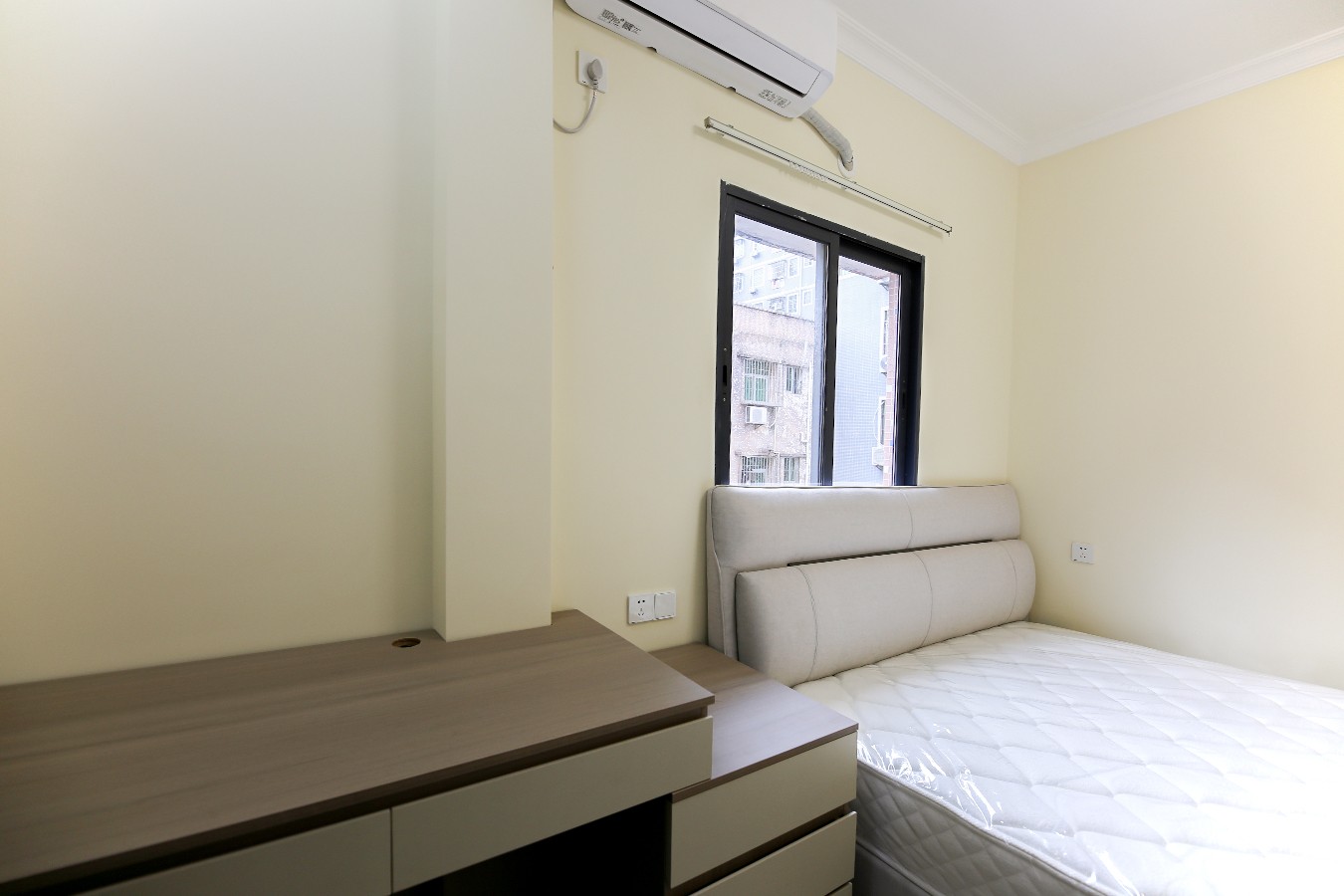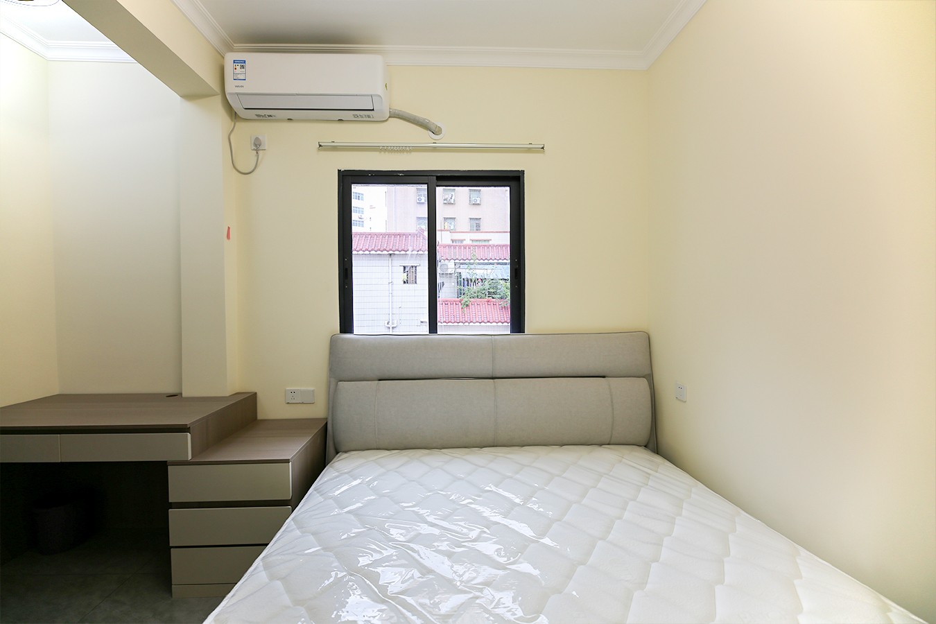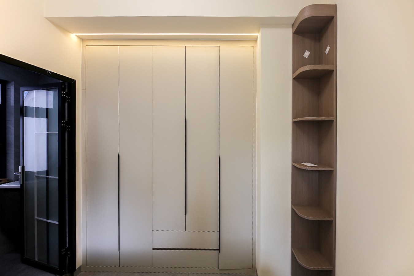 主卧延续了客厅的基调,浅黄色+白色的搭配,进门书桌+床头柜的组合,床尾靠墙定制的到顶衣柜,氛围灯带提升室内的情调,设计简约而质感,在视觉上营造出恬静温暖感。