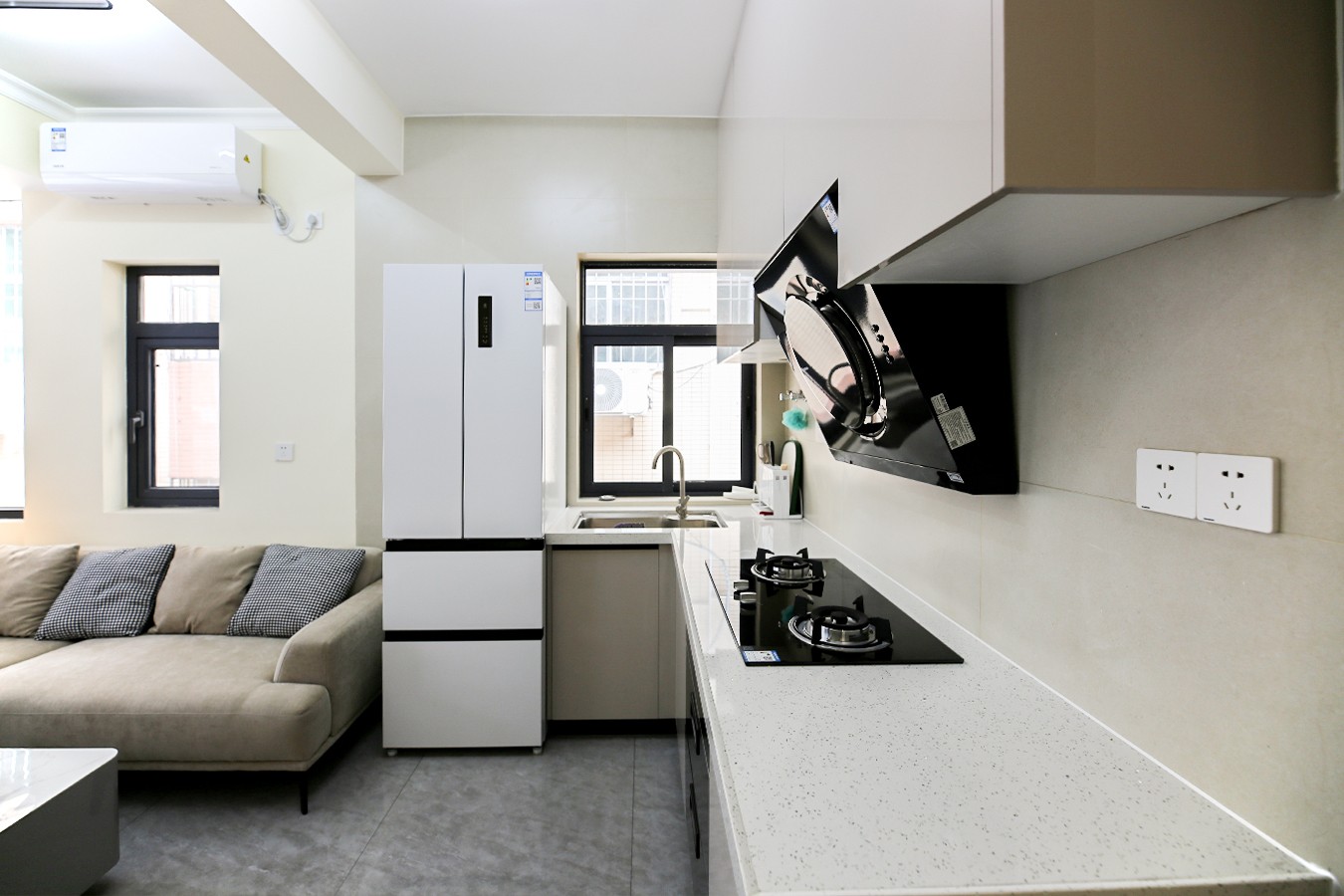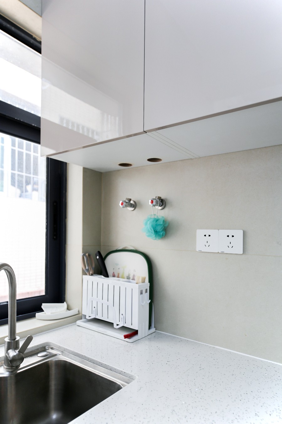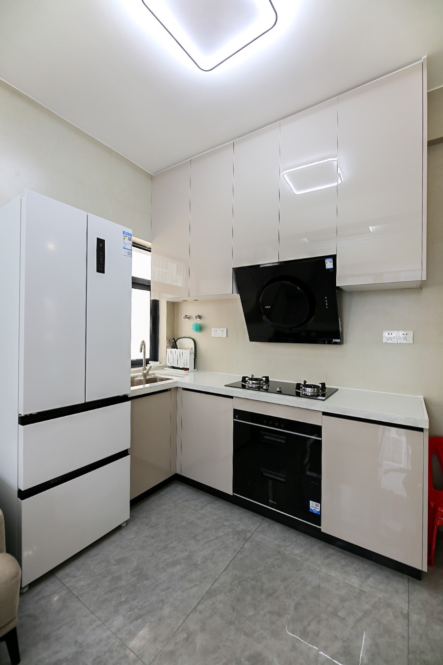 开放式的厨房设计,增强室内视野,让空间更加通透宽敞。厨房整体以黑白灰为主,灰色柜子与黑色厨具搭配,视觉清爽简洁。