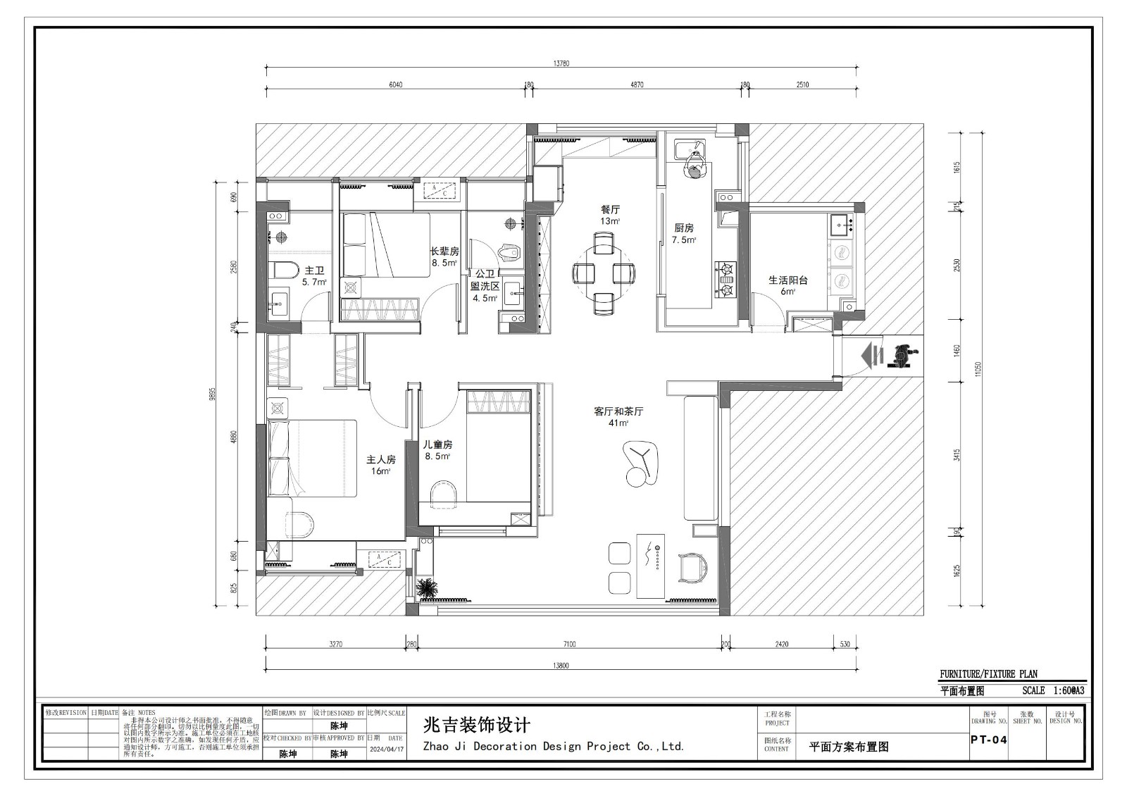 此户型为标准的小三房,户型痛点是客餐厅区域太小,厨房不能满足客户烹饪及储物功能;设计上,将阳台区域并入客厅区域,将晾晒功能放置在入户花园部分,厨房缩小,放大餐厅的同时,将部分厨房储物烹饪功能放置在餐厅,整理以现代简约风格设计,放大空间感,打造舒适简约的生活空间;