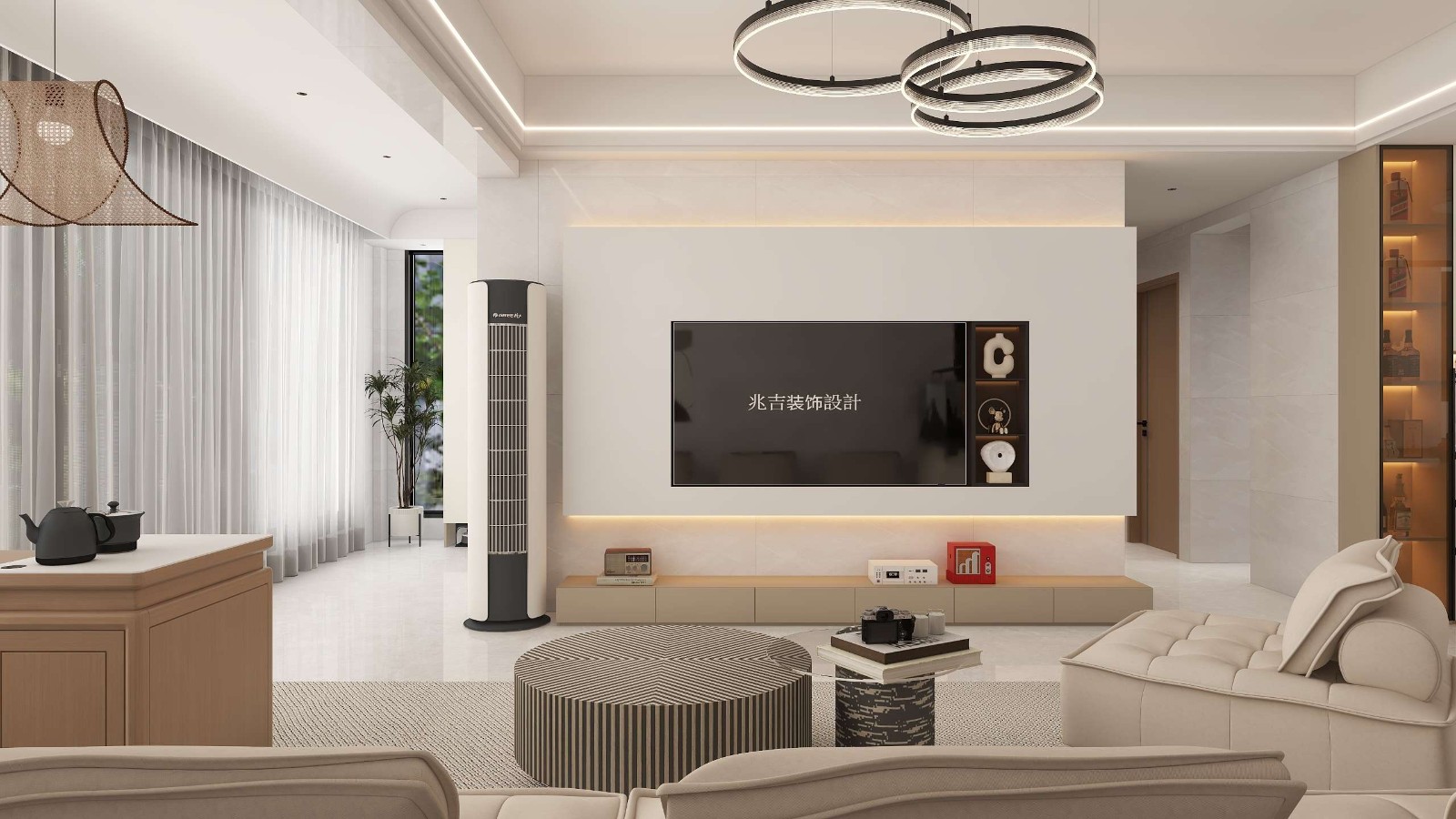 客厅以白色系墙面及造型电视背景为基础,点缀以木饰面,电视背景藏灯;天花以简约的走边天花,打造简约大方的客厅空间;