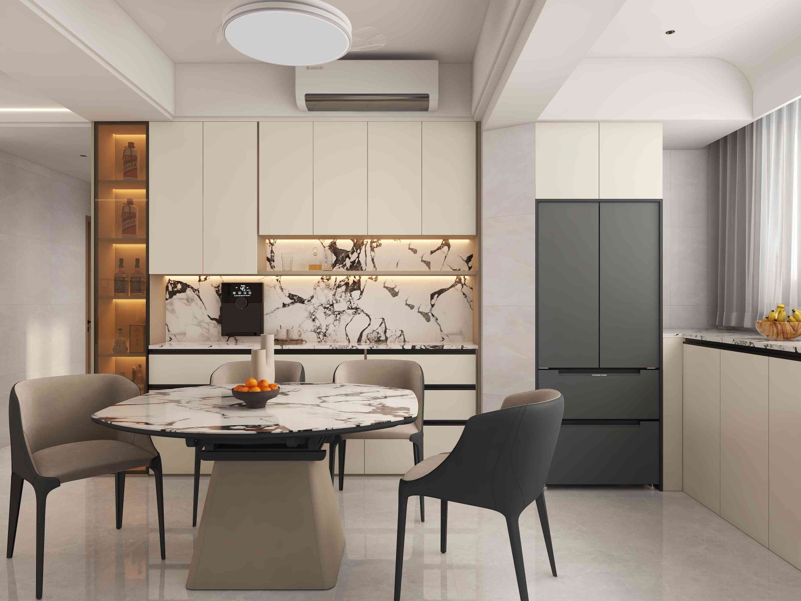 餐厅考虑展示及储物柜体,以奶白色木饰面为基础,以宝格丽岩板点缀,玻璃柜门加灯光跳色,打造整洁明亮的就餐空间;