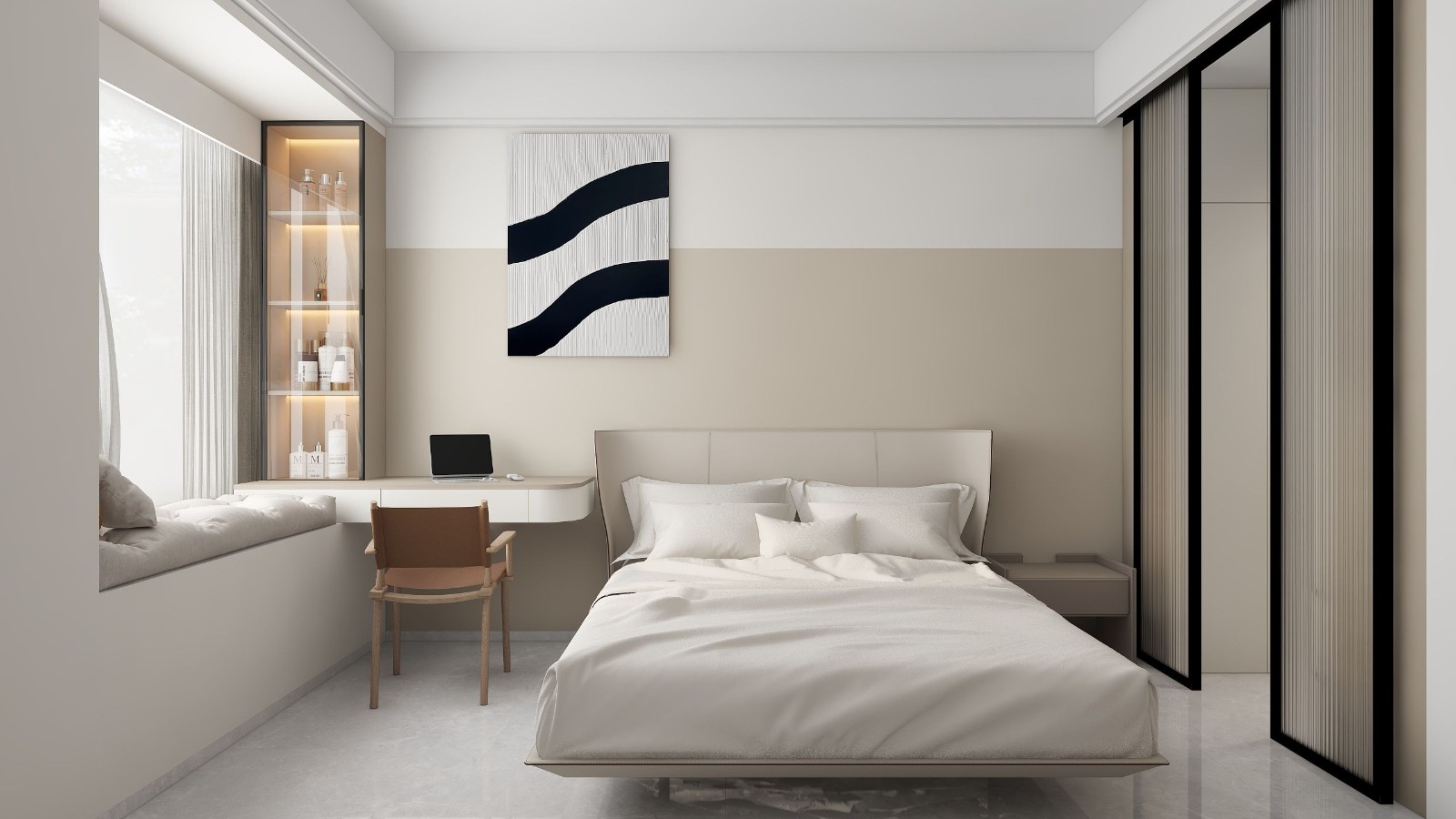 卧室以奶白色加白色乳胶漆作为背景墙,搭配线条感的床品,双眼皮天花装饰,飘窗部分玻璃柜体装饰,温馨舒适;