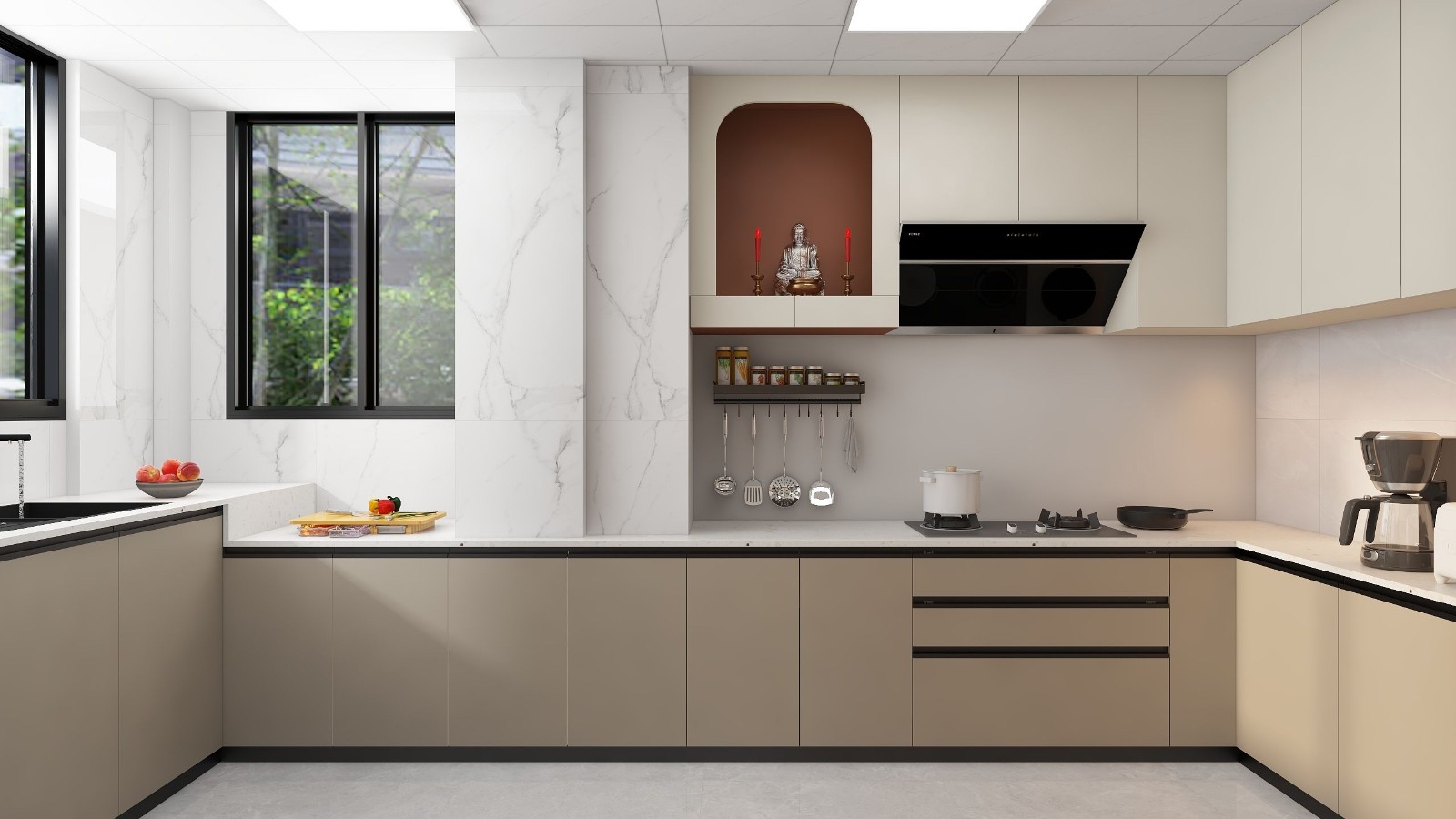 厨房墙面选择浅色石材纹理瓷砖,吊柜奶白色柜体,辅以木饰面地柜,满足厨房烹饪储物功能;打造温馨易使用的厨房空间;