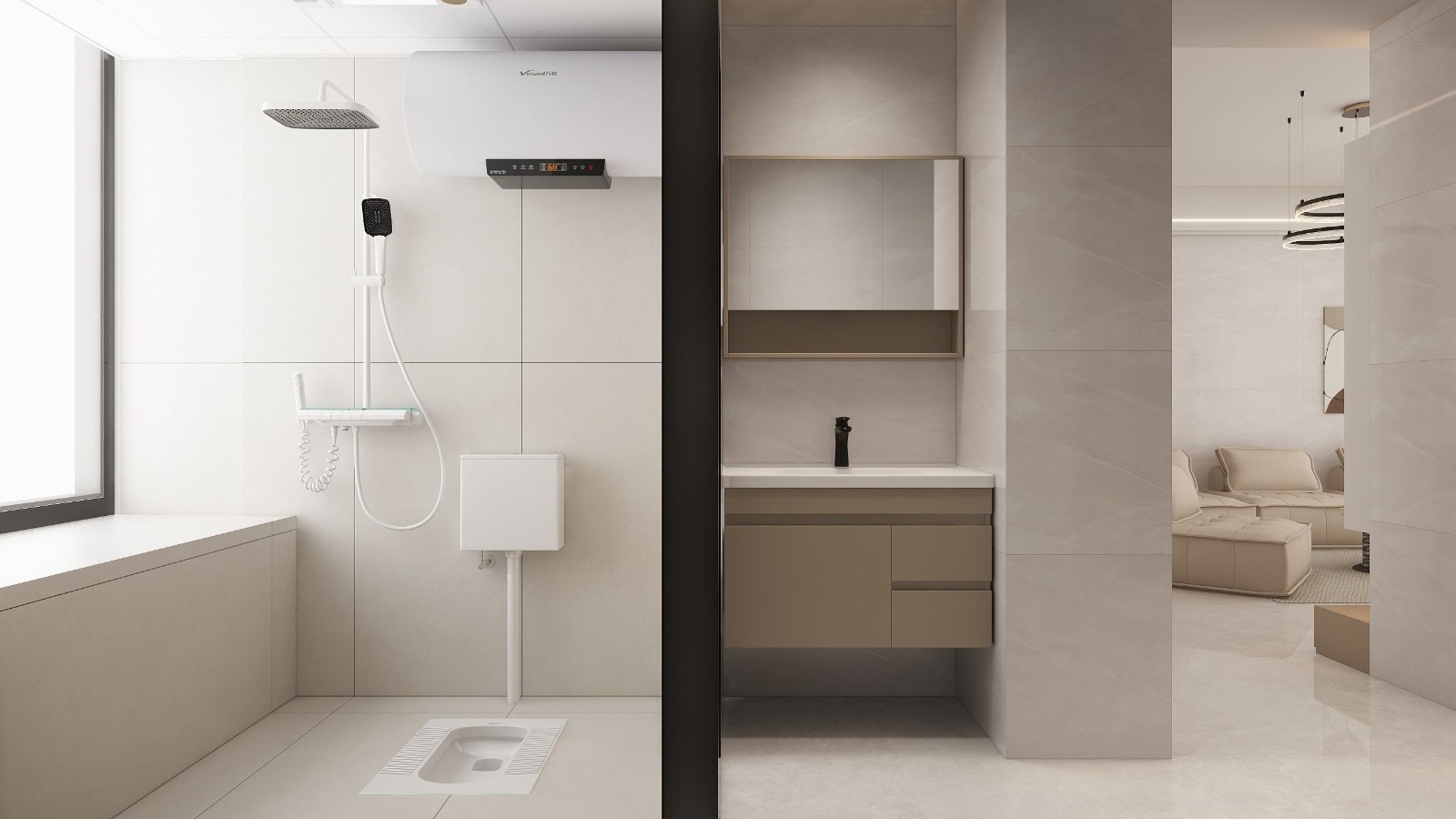 卫生间沿用奶白色设计定调,台盆应用木纹色作为跳色,整理空间简约易打理;