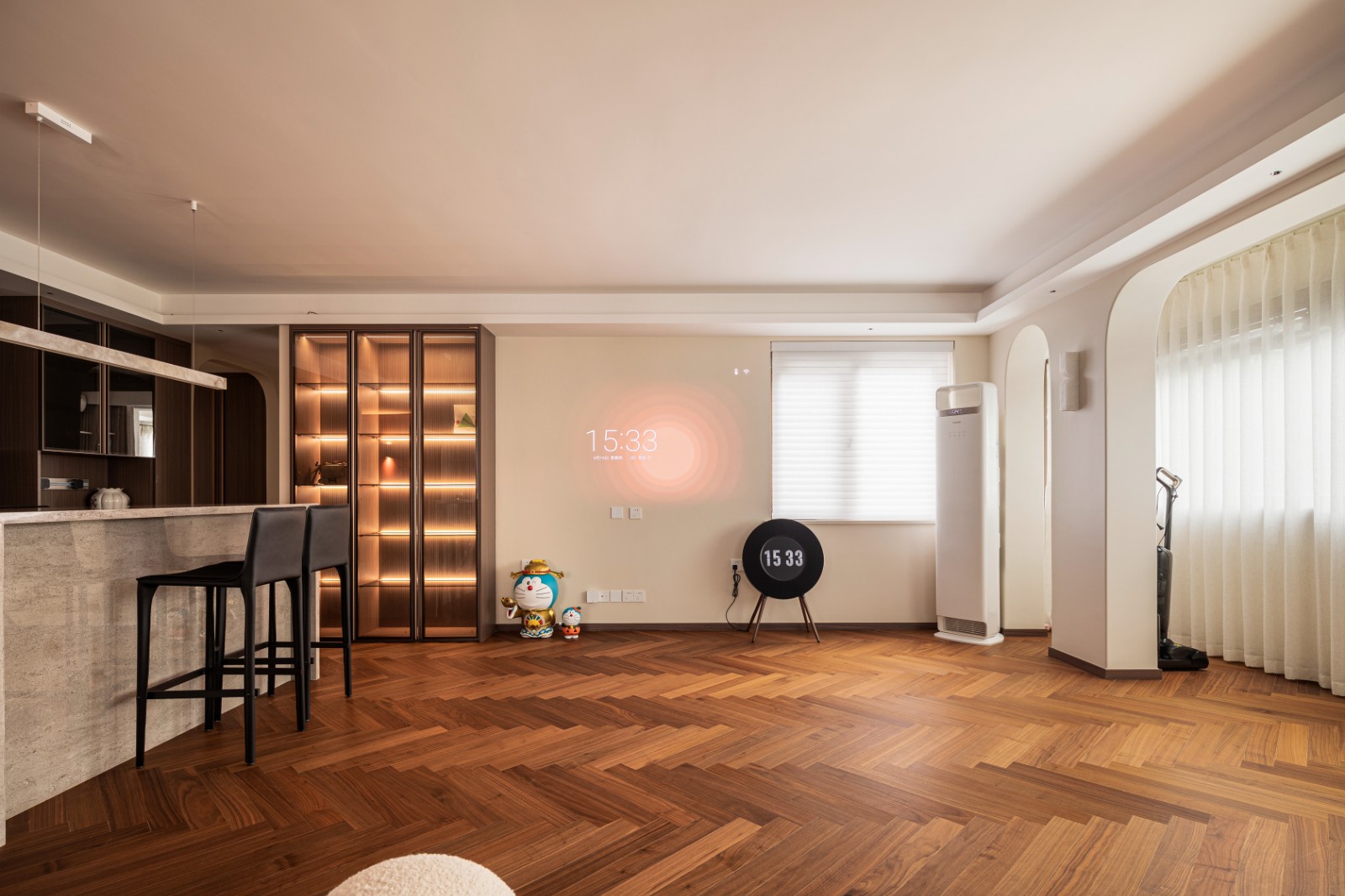 客厅无主灯,视线穿梭虚与实的边界,温柔拂去尘世喧嚣,从前尘往事中捧出暖意,时光此间流淌,却不惊扰这片恬静,只余一丝若有若无的柔光,轻轻点染岁月底色。