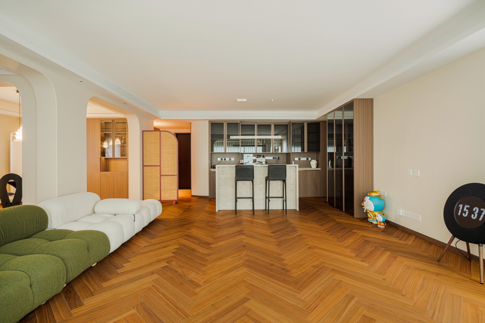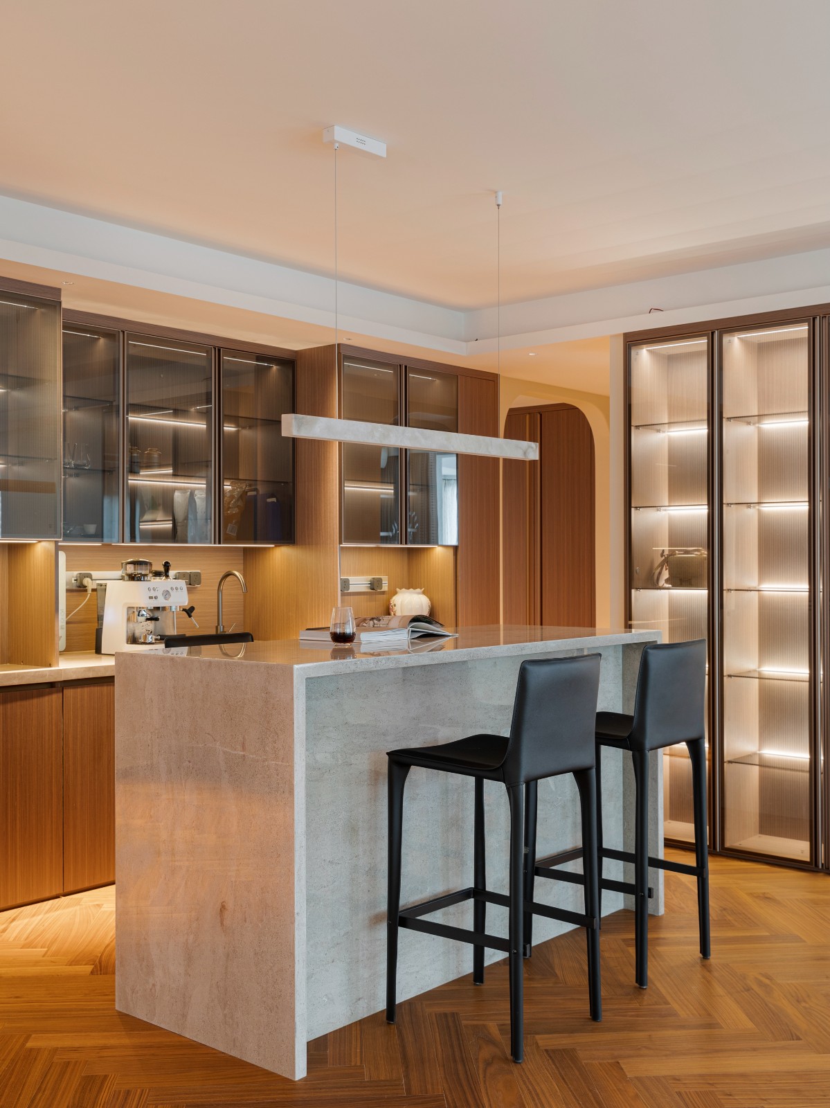 岛台将时光的界限轻柔抹去,玻璃柜门、原木柜体织就幽幽剪影,眺望餐厅,每一帧闪耀过往光影,书写电影般的迷离。