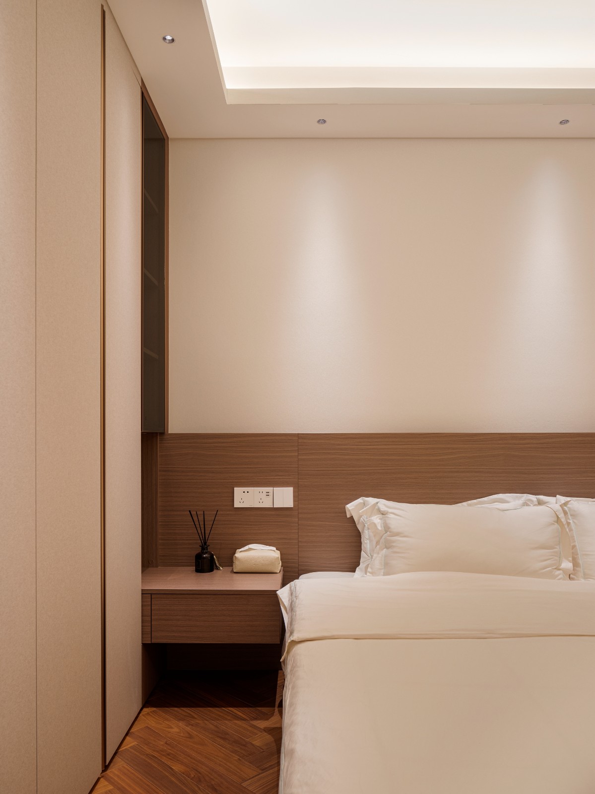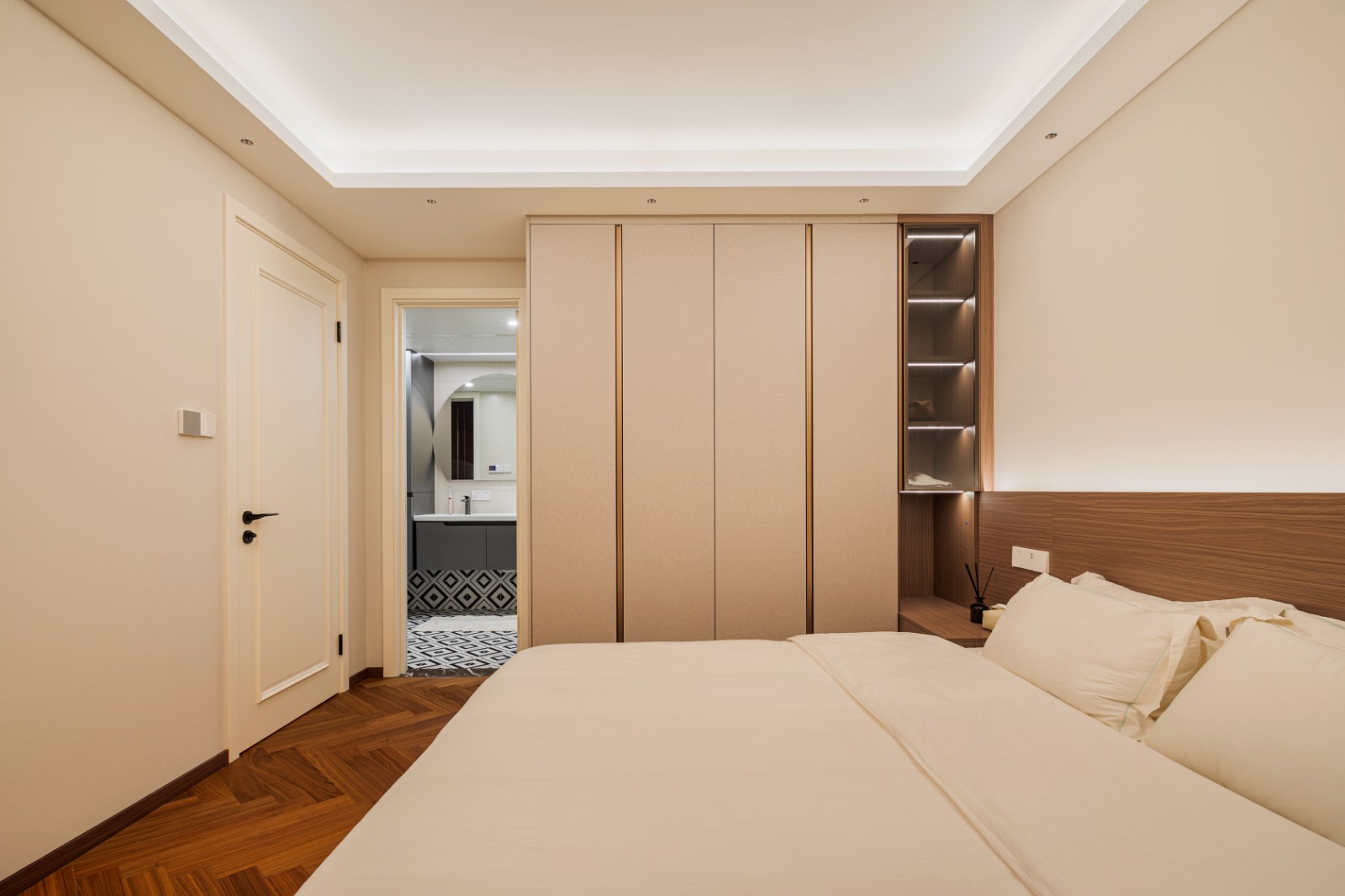 暖焦糖色真的超美,像是被月光漂洗过,散发出淡淡的、几乎透明的光泽,在朦胧中绽放。墙面刷上温暖的奶白色,恰到好处的浪漫,带来不言自明的柔情。