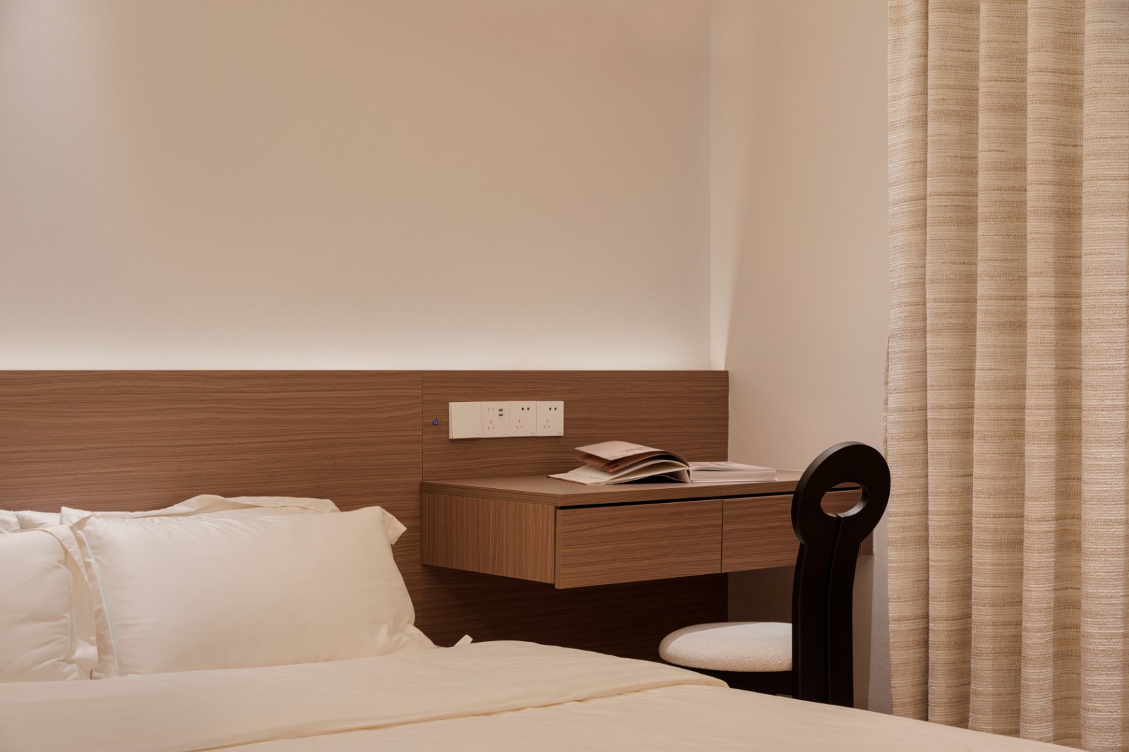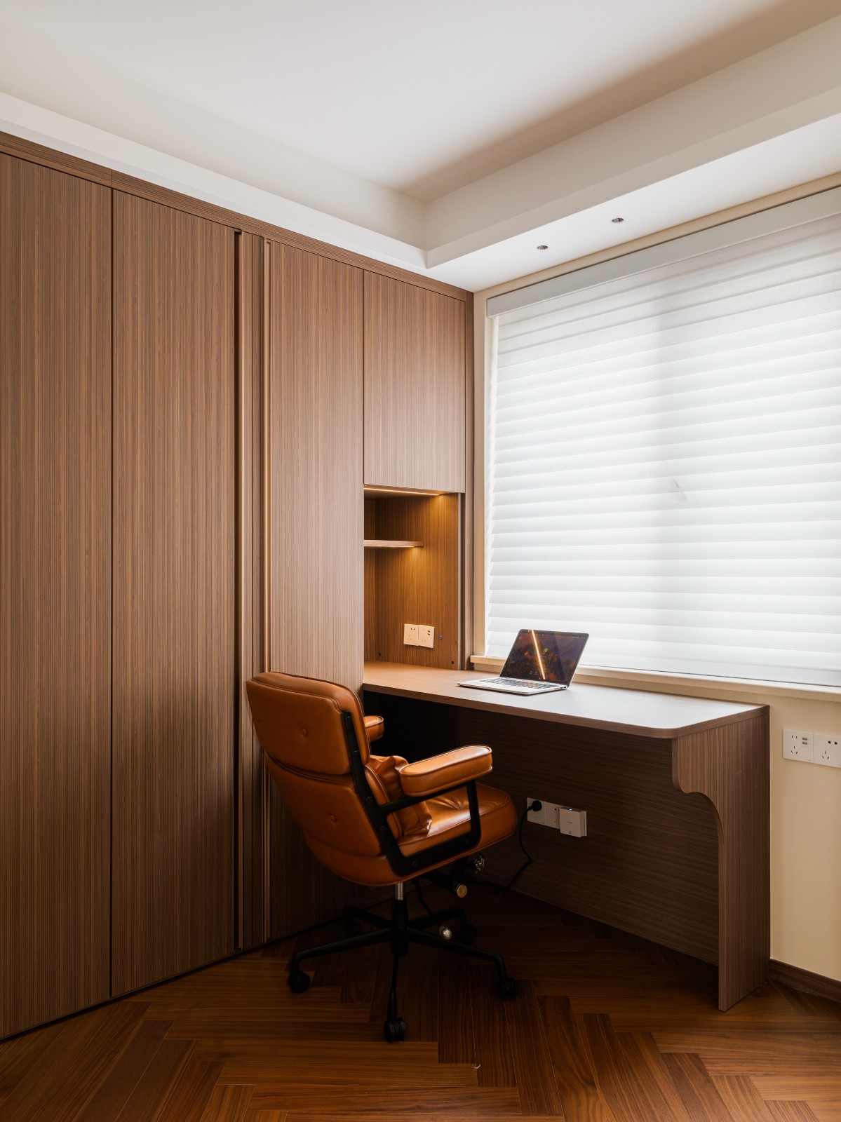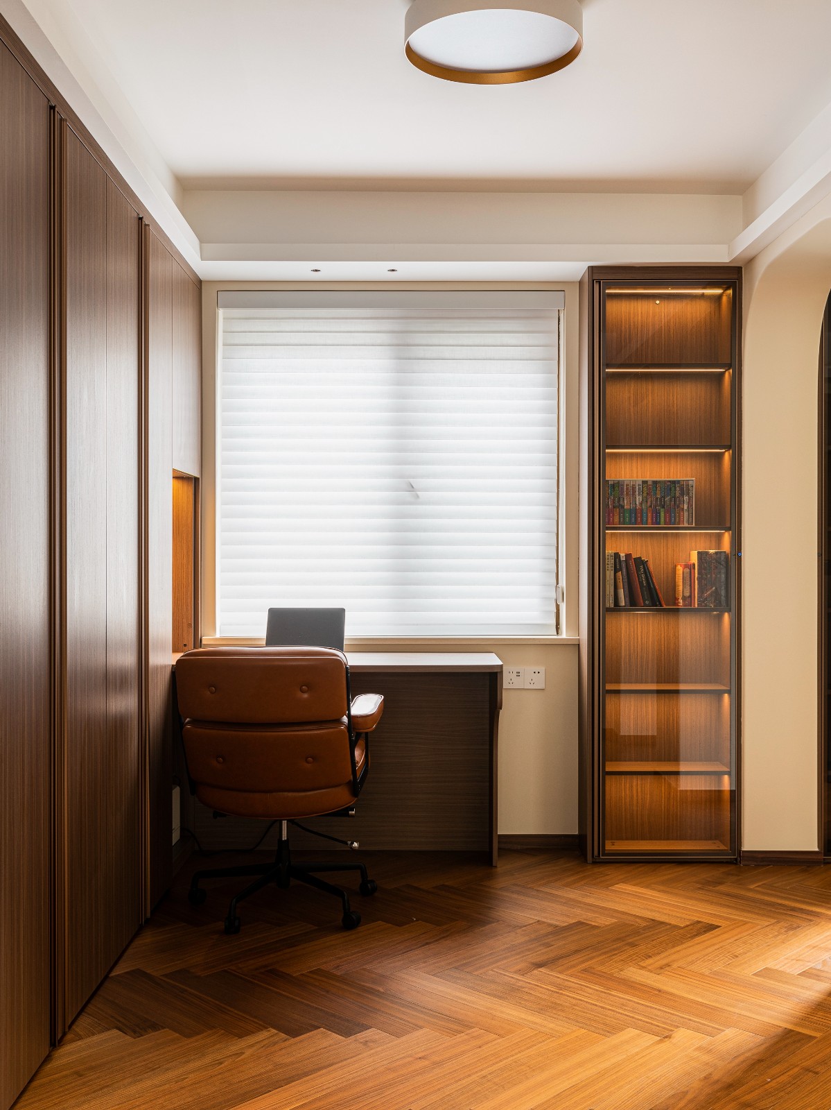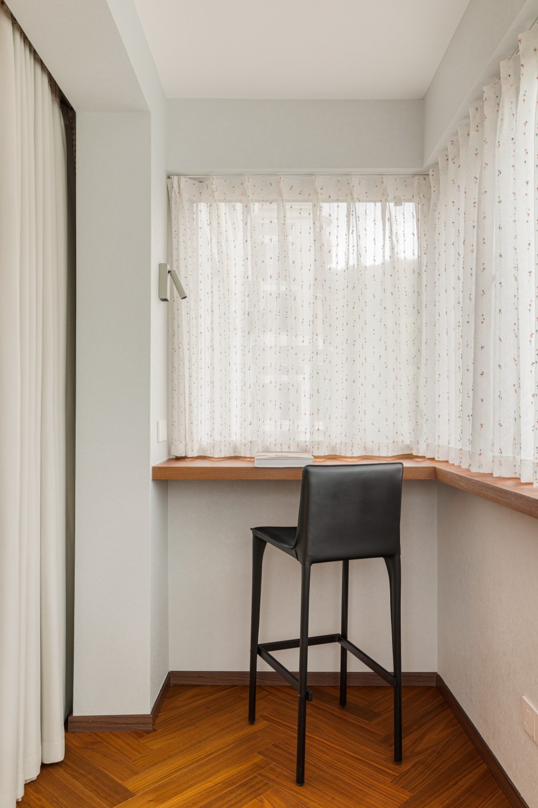 卧室一隅细腻雕琢成读书角,藏匿日常喧嚣,每一本书都是一段旅程,每一行文字都承载梦想与远方。焦糖地板像是大地的画布,每一步都在诗行间跳跃。