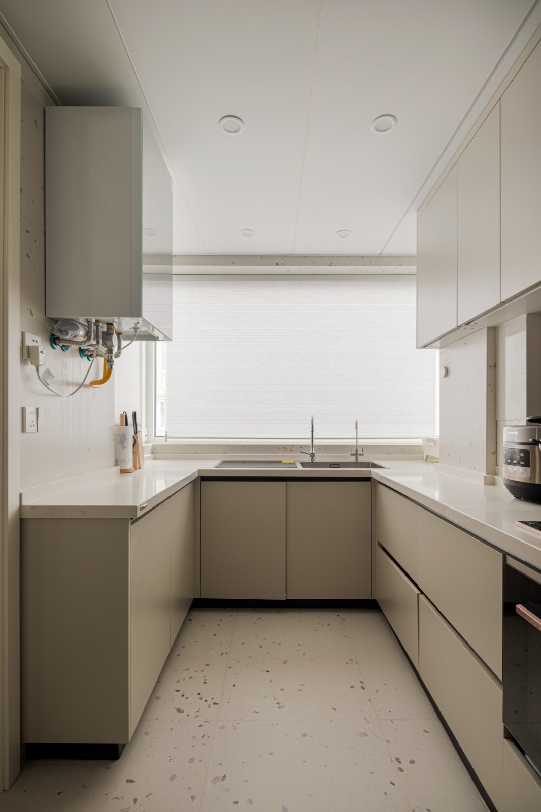 厨房U型布局,纯白台面仿佛是天边流云的一角,黑色电器点缀其间,宛若天成。米白橱柜温柔雅致,奶呼呼的令人心动。