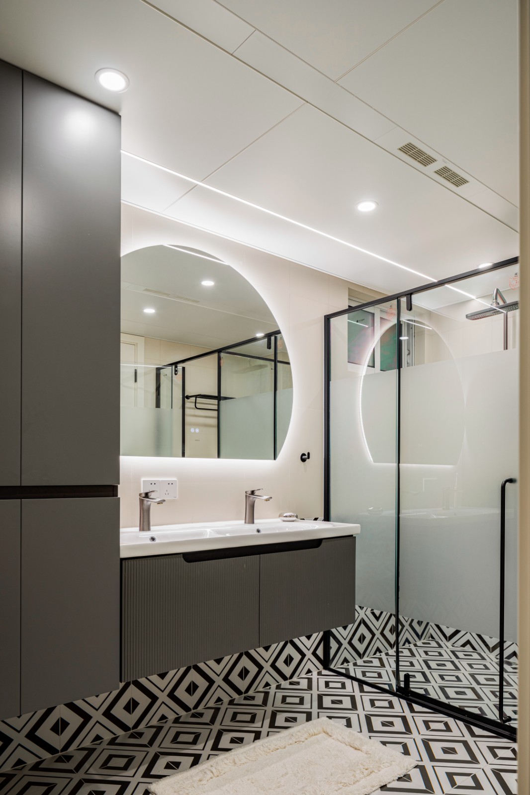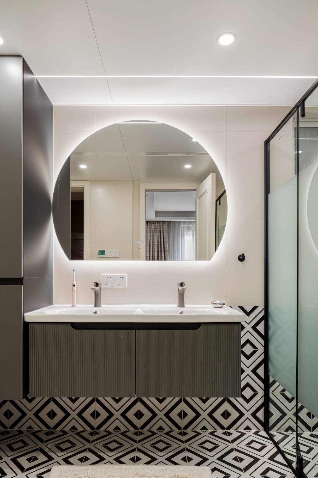 灰白浴室柜与浴室镜交相辉映,仿佛时间的瑰宝,闪烁岁月沉淀,映射光影绝美。颜色间的过渡,像是清风拂过,水波荡漾,轻柔又深邃,沉溺其中。