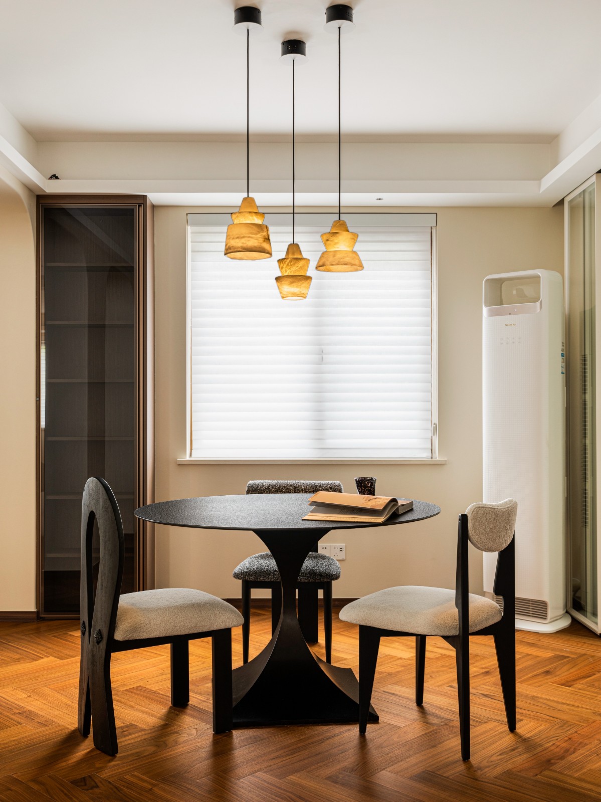 三盏吊灯似夜空中的星辰静静垂挂餐桌上方,点缀一抹无尽的中古浪漫,编织梦境绚烂,夜暗方显万颗星,灯明始见一缕尘。
