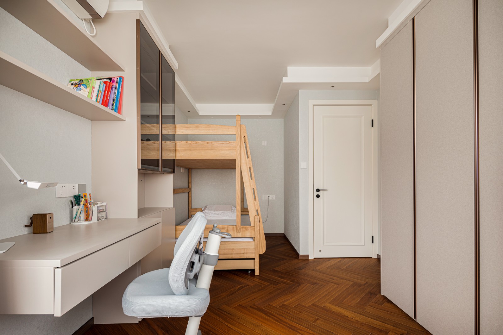 原木高架床轻柔托起孩子的童年,枕星河入梦,与梦中的伙伴一起,遨游在无边的幻想国度。学习桌安然伫立,陪伴孩子四季,见证成长的每一刻。