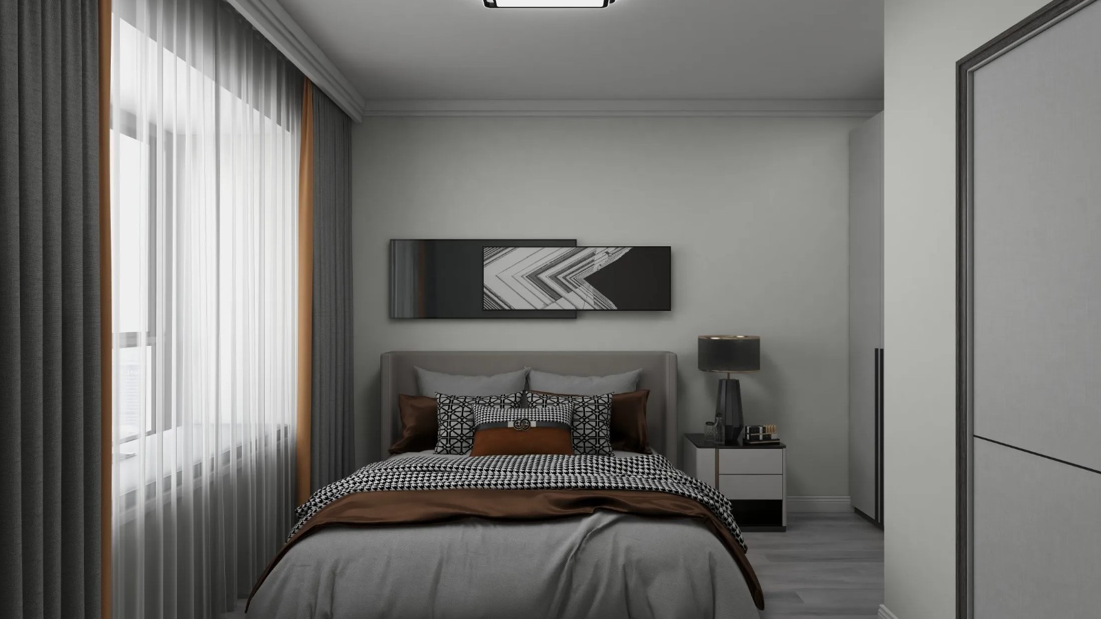 卧室单独设置了筒灯并在床头暗藏光源,保证了光源的灵活使用,半透明纱帘既有私密性又通透。