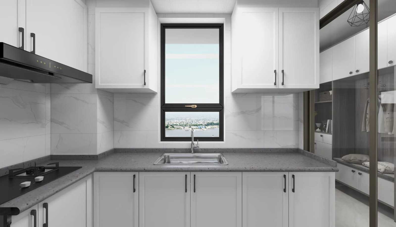 厨房做一体式设计,纯白色的柜体强化极简之感,扩大了视觉感受。方块瓷砖防溅区域方便清洗,炉灶区暗藏光源使用起来更加便利,并且设置了多样的储存方式,橱柜与隔板提供充足收纳面积,黑色厨具的点缀简约大气。