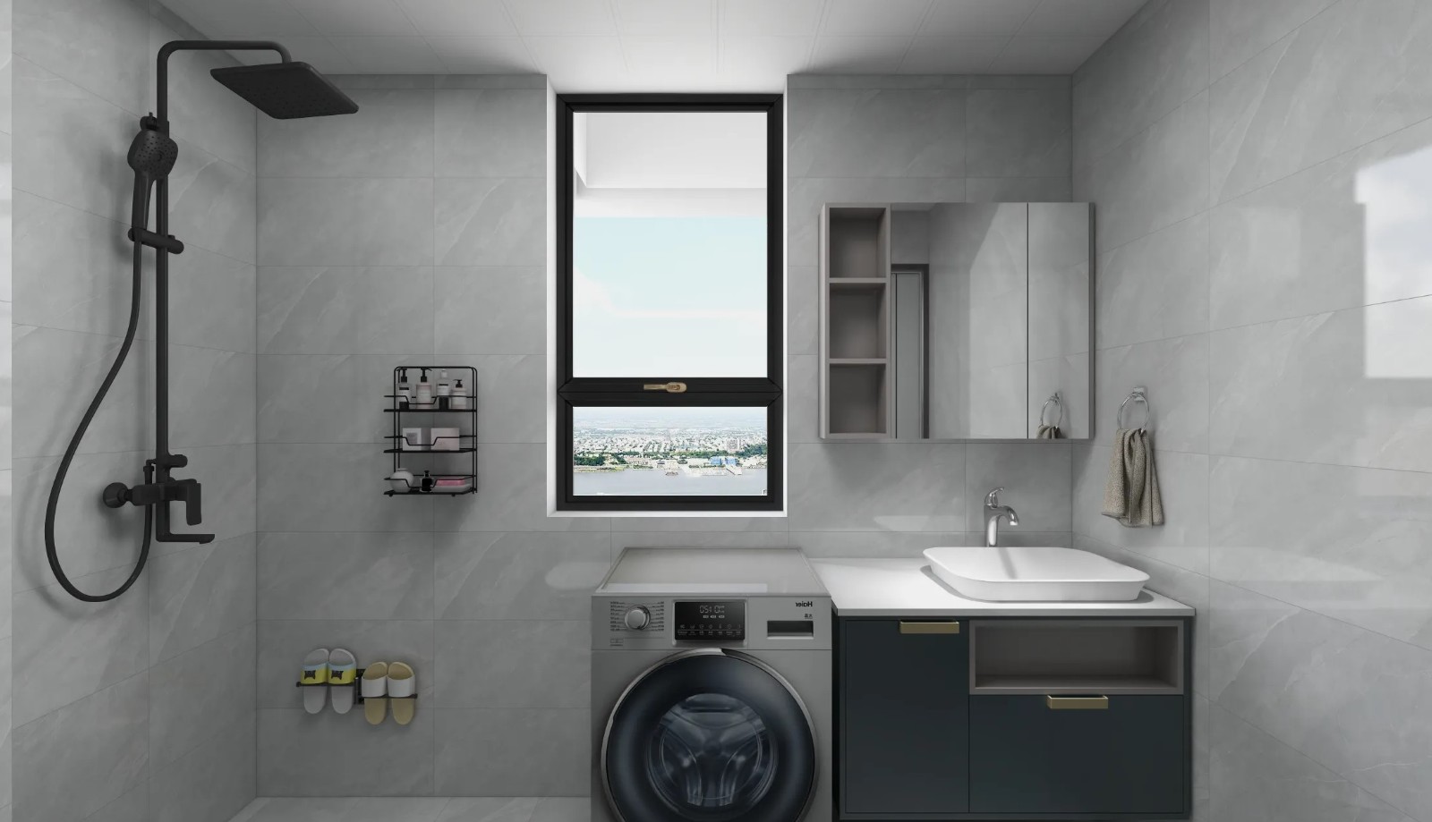 卫生间以灰色为主,增添黑色,碰撞出***感,挂壁马桶节省空间。