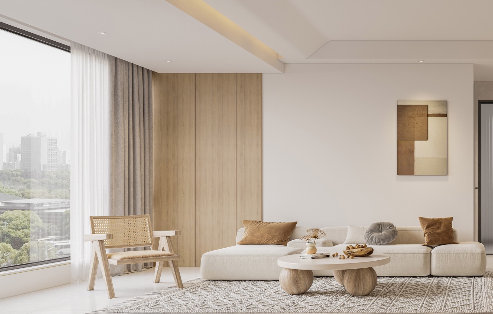 沙发背景以木饰面装饰白色墙面,搭配相同色系的沙发家具,简约而不简单。