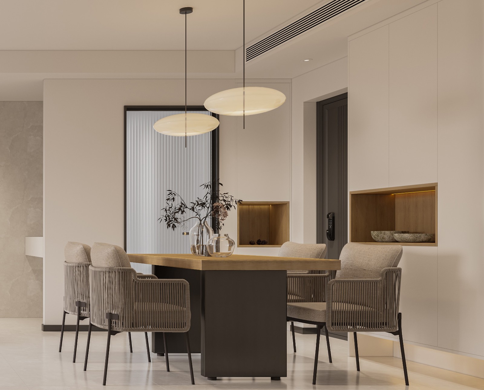 公共空间整体以暖色系为主,温柔的奶白色搭配原木色木板,黑色线条,整体既现代又不失温馨。入户两侧的鞋柜以底部抬高和中间镂空的形式相结合,悬空的部分放置日常出入的鞋子,镂空部分放置包包钥匙等随手物品,更显人性化。