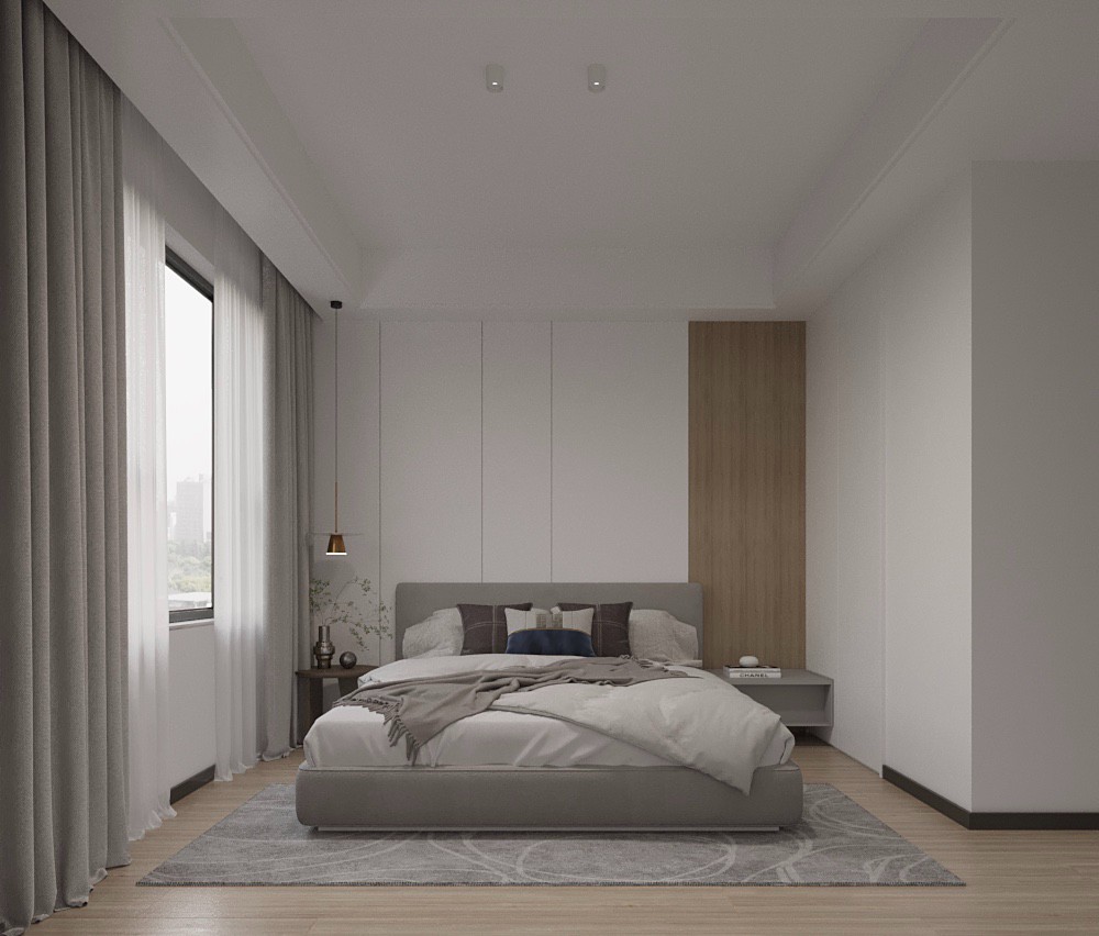 卧室的色调偏灰,床头背景以灰色的色漆装饰。卧室的衣柜门板与墙面使用相接近的颜色,更为整体。在卧室地板的选择上,使用浅色系的地板更符合空间的氛围。