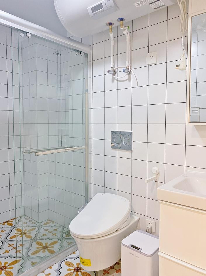 纯白的墙面瓷砖,花雕的彩色地砖、沉稳黑的时尚美缝。