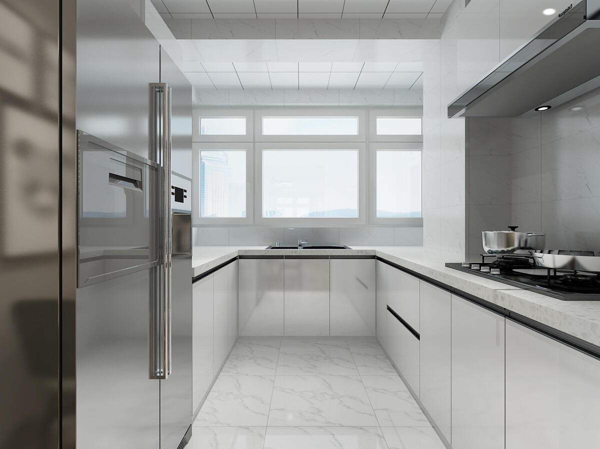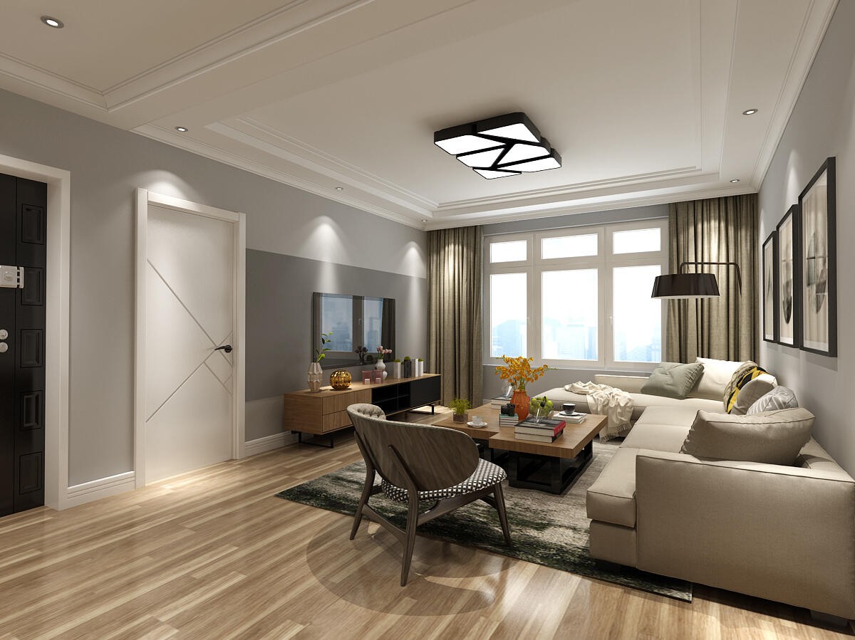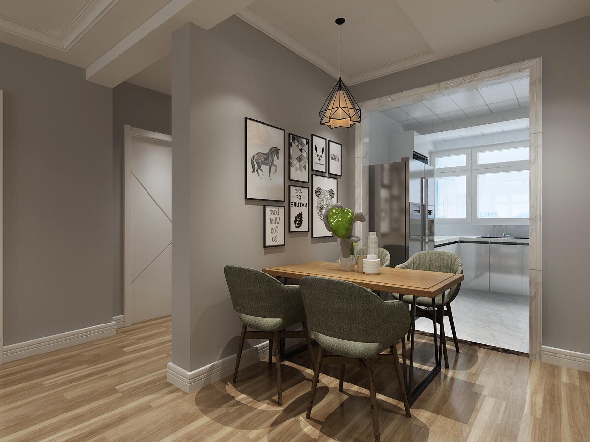 客厅区,电视背景墙深灰色部分采用双层石膏板,浅灰色是全屋乳胶漆调色的,层次分明凸显电视背景墙区域。 客厅吊顶是一层40公分宽的边吊,底边圈一圈石膏线,中间两层石膏板做的层次感,因为层高只有2.7米 去掉地热也就2.6左右,所以灯具采用的简单吸顶灯,这个灯很好买的,tb一搜都是。飫罢汾厨房原来没有这么大,因为把北阳台拆掉扩进厨房里,所以厨房空间变得很宽敞,橱柜也是采用的烤漆门板,简约大方,(不过烤漆
