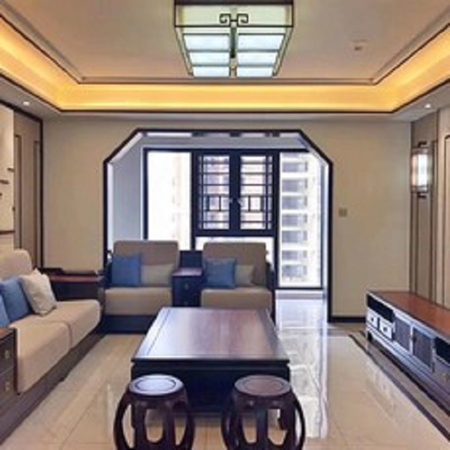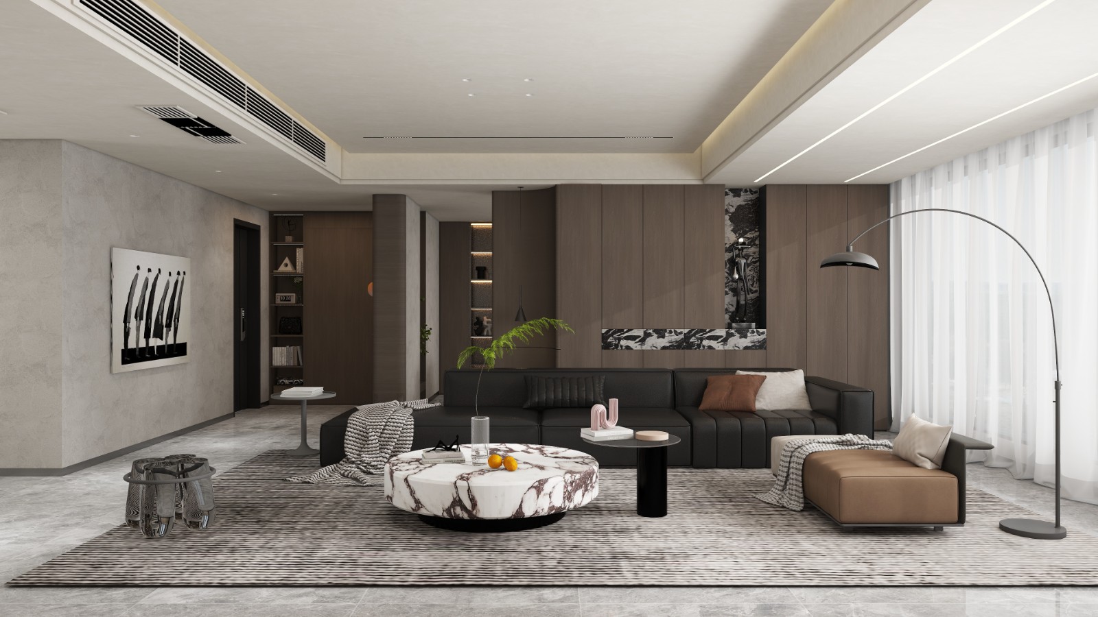 客厅取消了电视墙,以会客为主功能的对坐沙发,在衣帽间门口上方藏光一个电动幕布作为投影,偶尔看个电影也是显得更有乐趣。