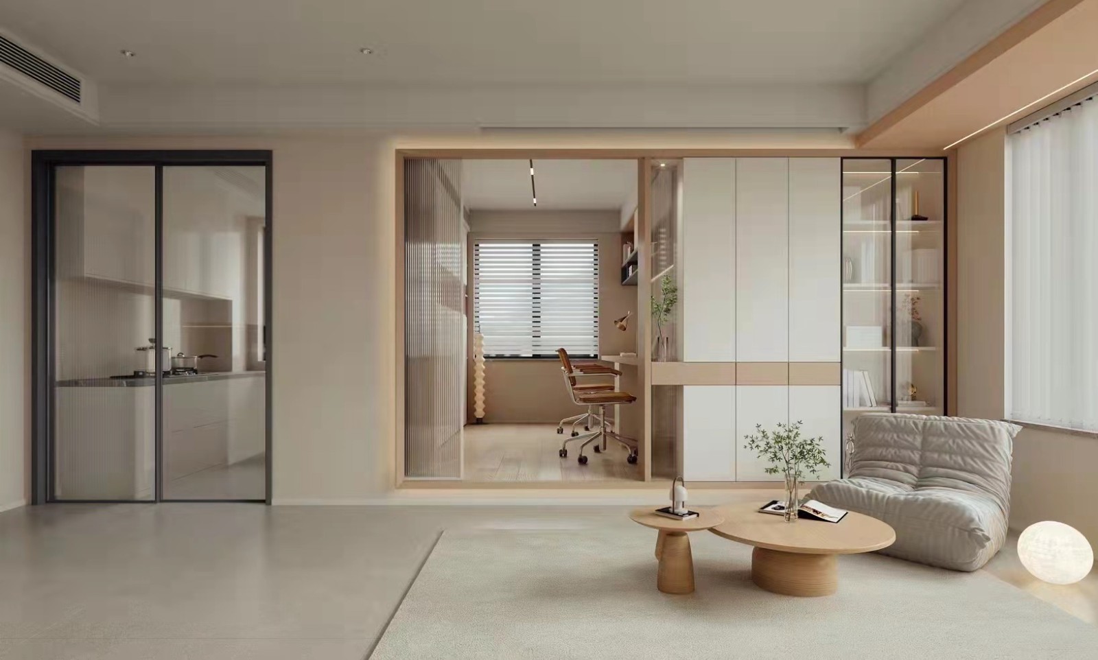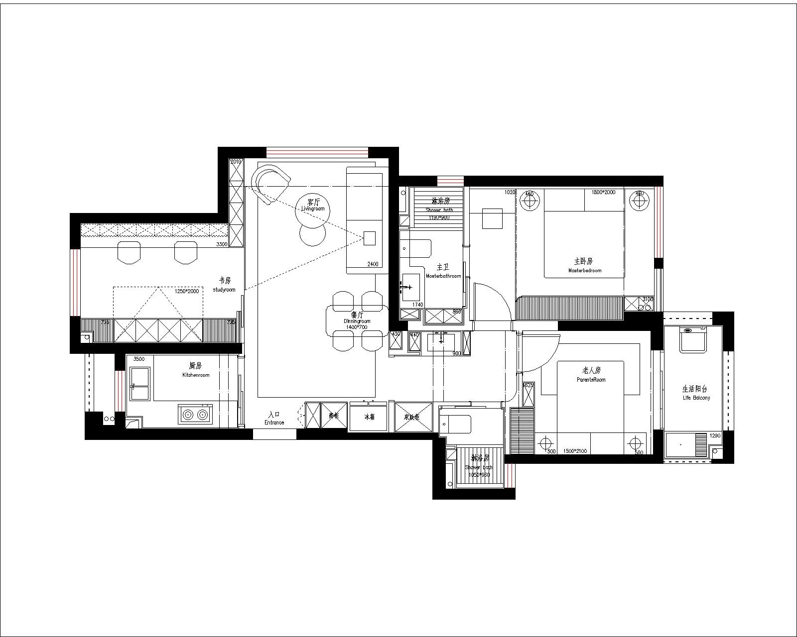 户型改动: 1:厨房两侧都为承重墙,无法改动空间,因此,将冰箱与高柜外置,尽量增加厨房台面的操作空间。 2:将客厅的飘窗位置拆除,客厅位置上移。改变原先餐厅的位置,将餐厅位置上移。将原先的餐厅位置作为厨房高柜,冰箱以及家政柜。 3:公卫干湿分离,将原先进入卧室的过道整体下移。 4:客厅使用投影仪,将左侧的卧室作为书房使用。门使用三推拉门。书房内利用一部分柜子,做下翻床,为后期使用。