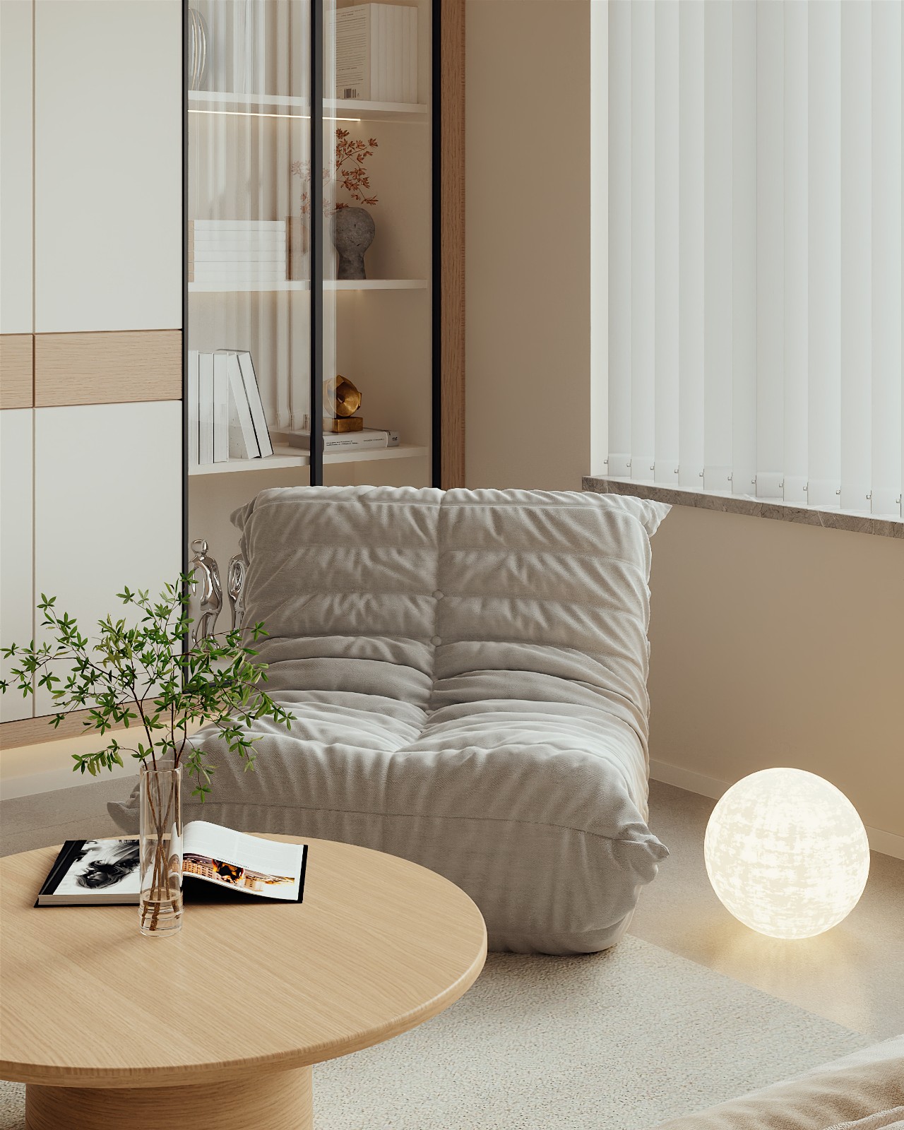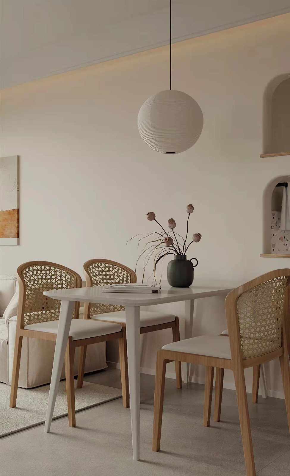 原木色搭配白色的空间自然舒适,加上设计感的吊灯,让精致的北欧氛围蔓延开来。