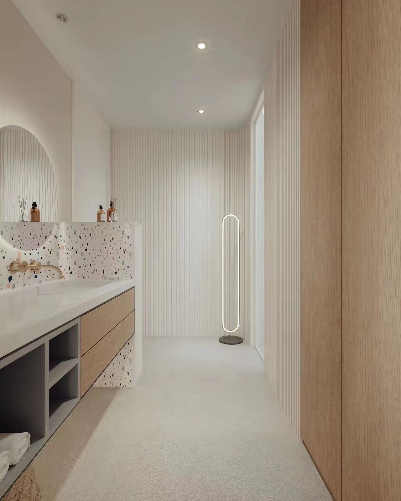 半包围式干区。一侧为墙体,遮挡住台盆,避免在客厅可以直接看到。一侧用矮柜,空间通透感更强。墙面使用水磨石瓷砖。