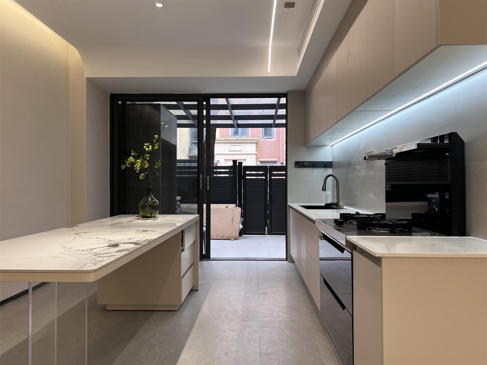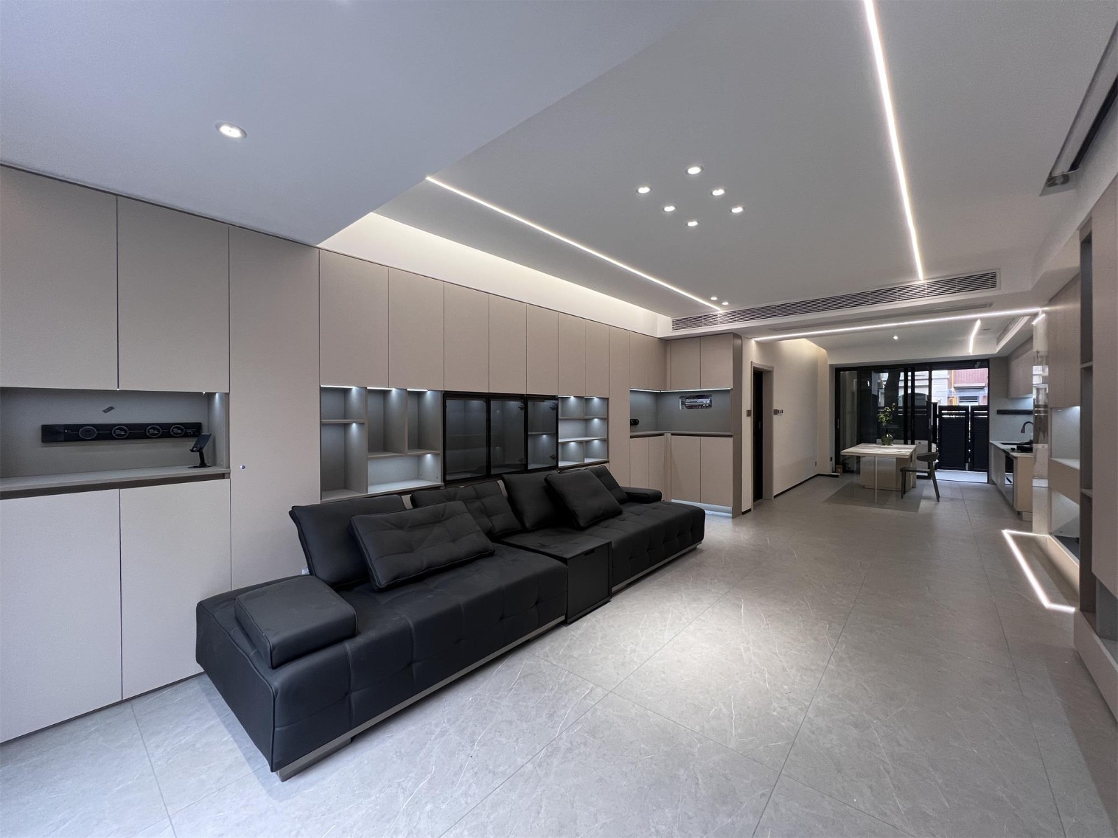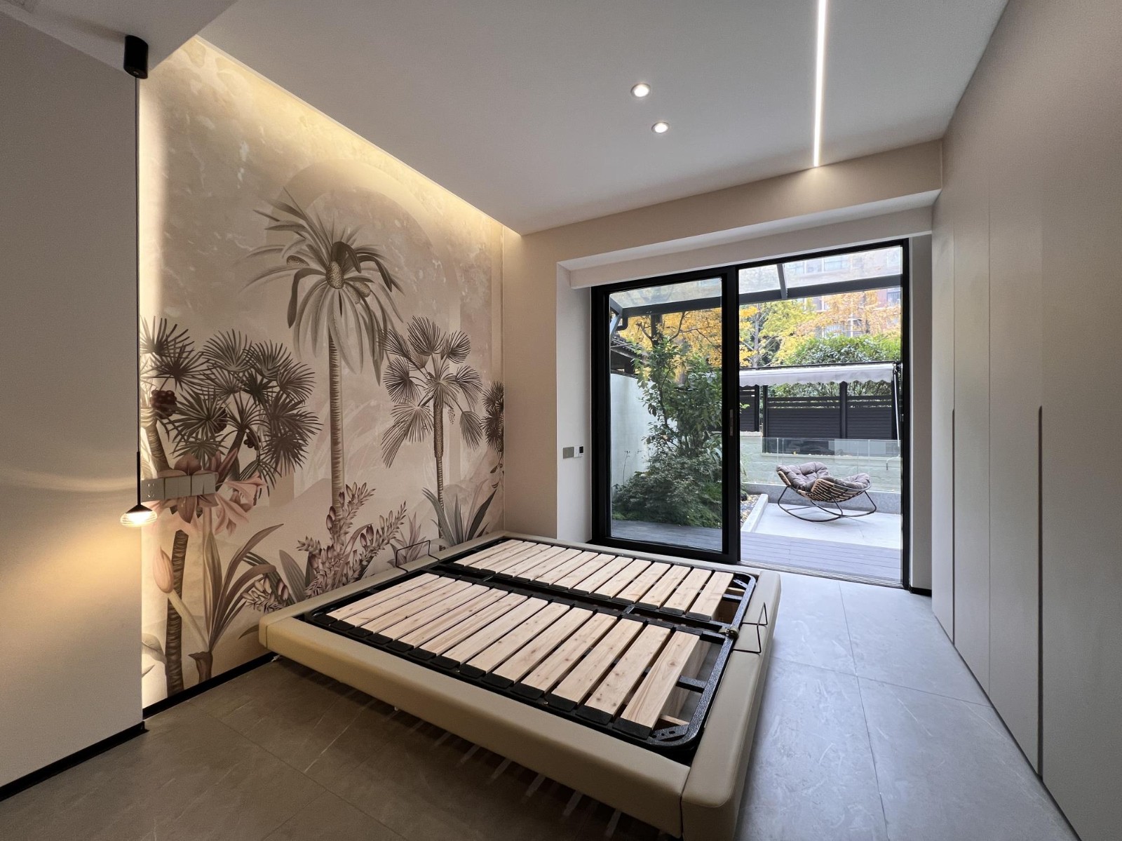 卧室推拉门设计出去就是庭院,推拉门能够灵活地分隔空间,保持室内外环境的互动与连通,同时又能确保卧室的私密性。这种设计在视觉上扩大了室内空间,为主人提供了更为舒适的环境。推拉门还方便日常使用,节省空间,提高了平时生活的便捷性。 卧室外采用灯带设计包围,地面和吊顶均融入灯光,为户外空间提供充足照明,增加美观度和功能性。