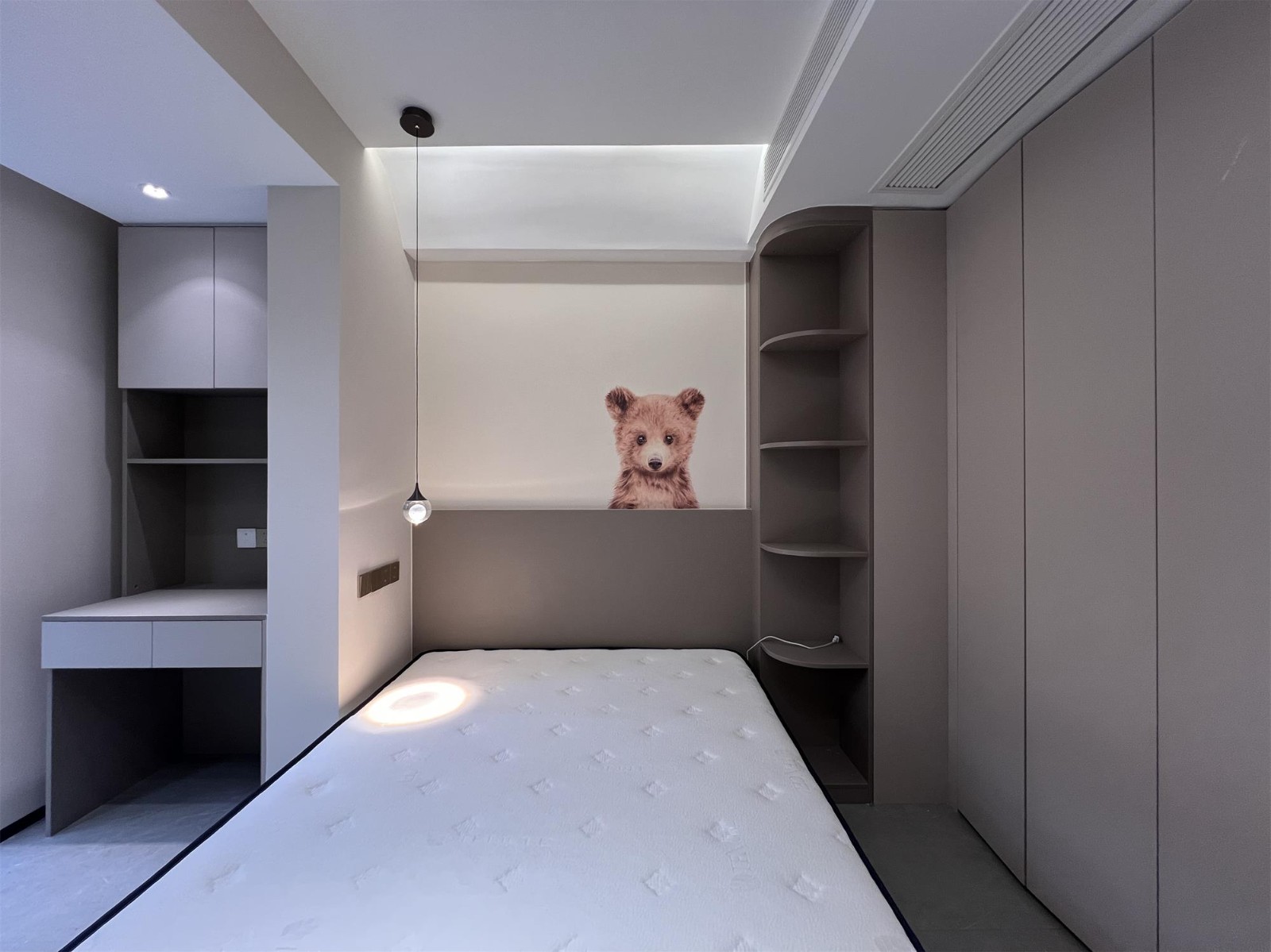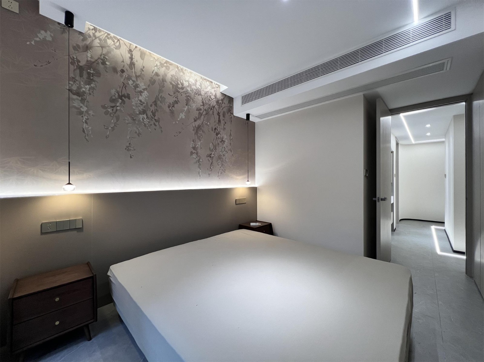无主灯设计能够根据需要调整亮度和色温,为卧室带来更多灵活性。这种设计不仅实用,而且美观, 吊灯和床头柜相呼应,营造出舒适和谐的氛围,让人感受到温馨宁静的睡眠环境。