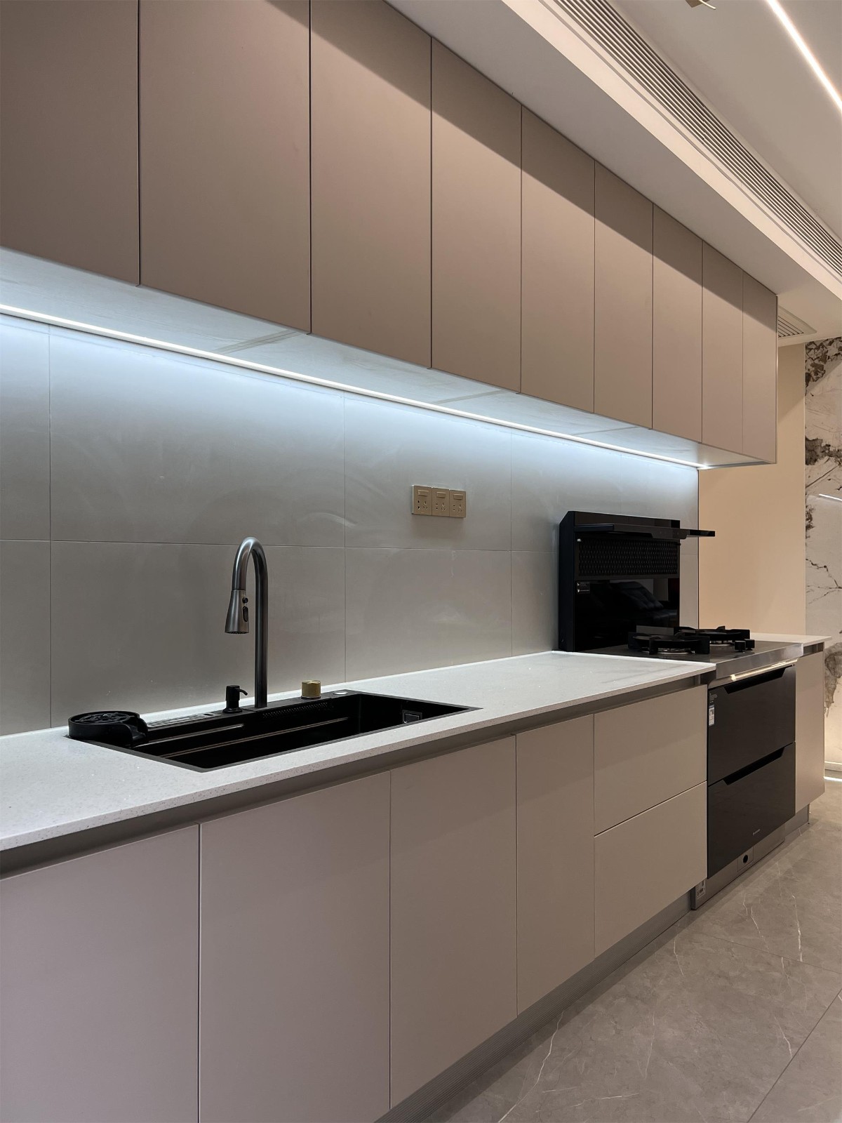 在厨房上方的橱柜安装灯带可以提供充足的照明,使得厨房操作区域明亮清晰,有助于提高烹饪效率和安全性。而且,灯带的设计美观,能够增添厨房的现代感和时尚感。可以有效的节省空间,避免传统的吊灯或台灯占用宝贵的厨房空间。