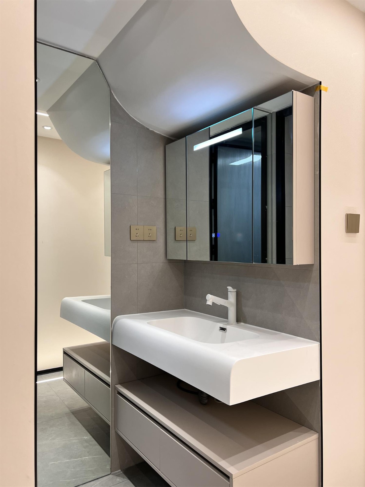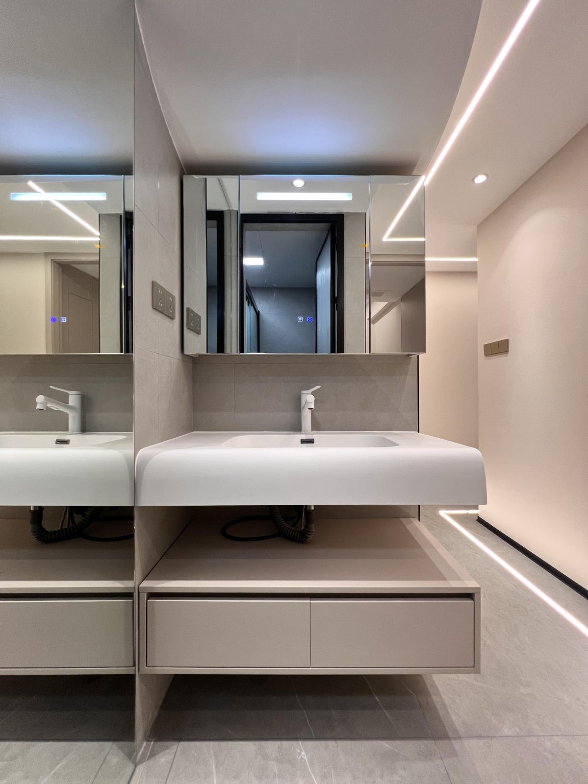 卫生间洗手台采用悬浮设计便于清洁和维护,悬浮式洗手台下方没有卫生死角,易于清理。增加空间感,悬浮设计使洗手台看起来更轻盈,有助于扩大卫生间空间感,提高防水性能。