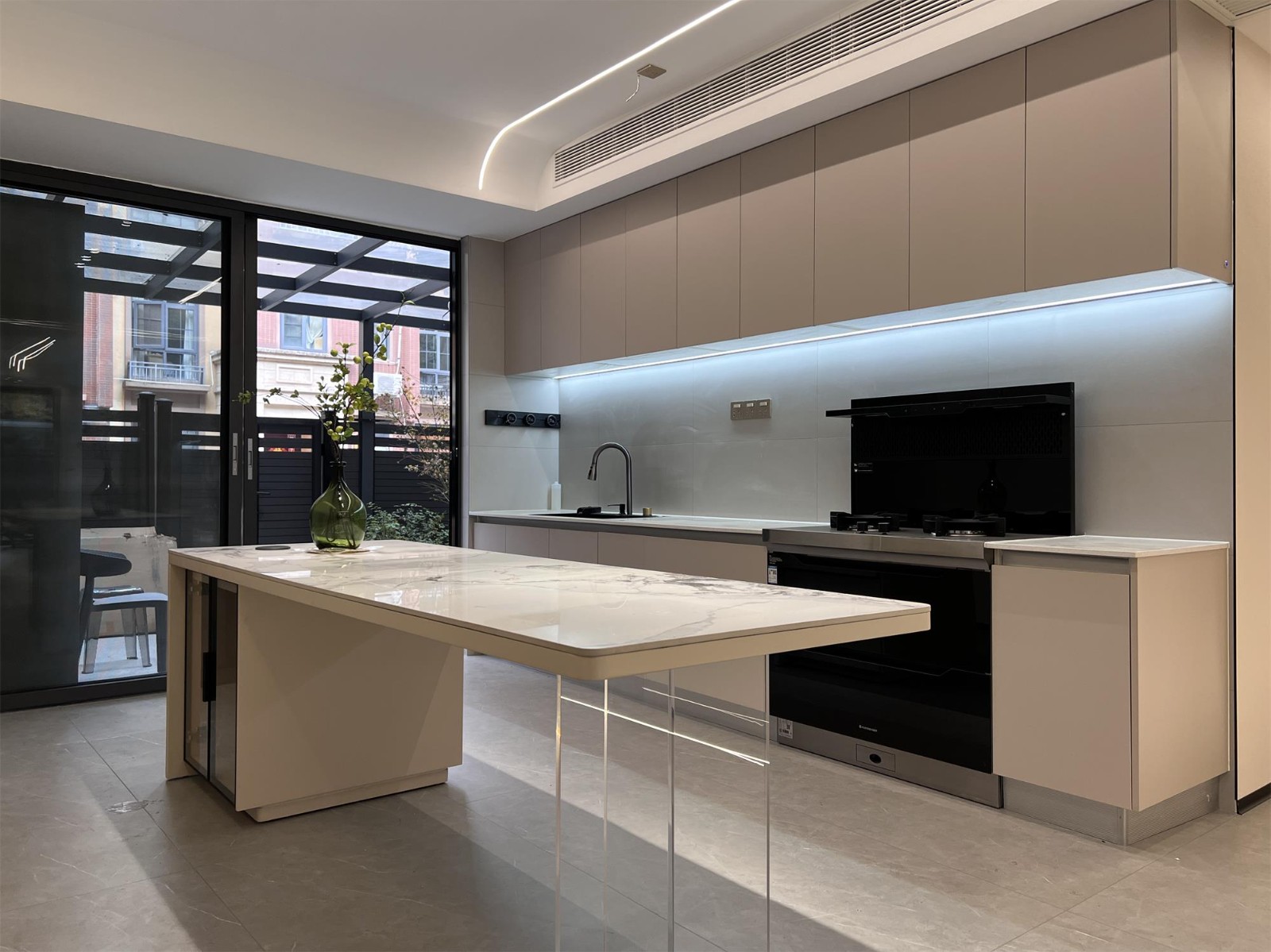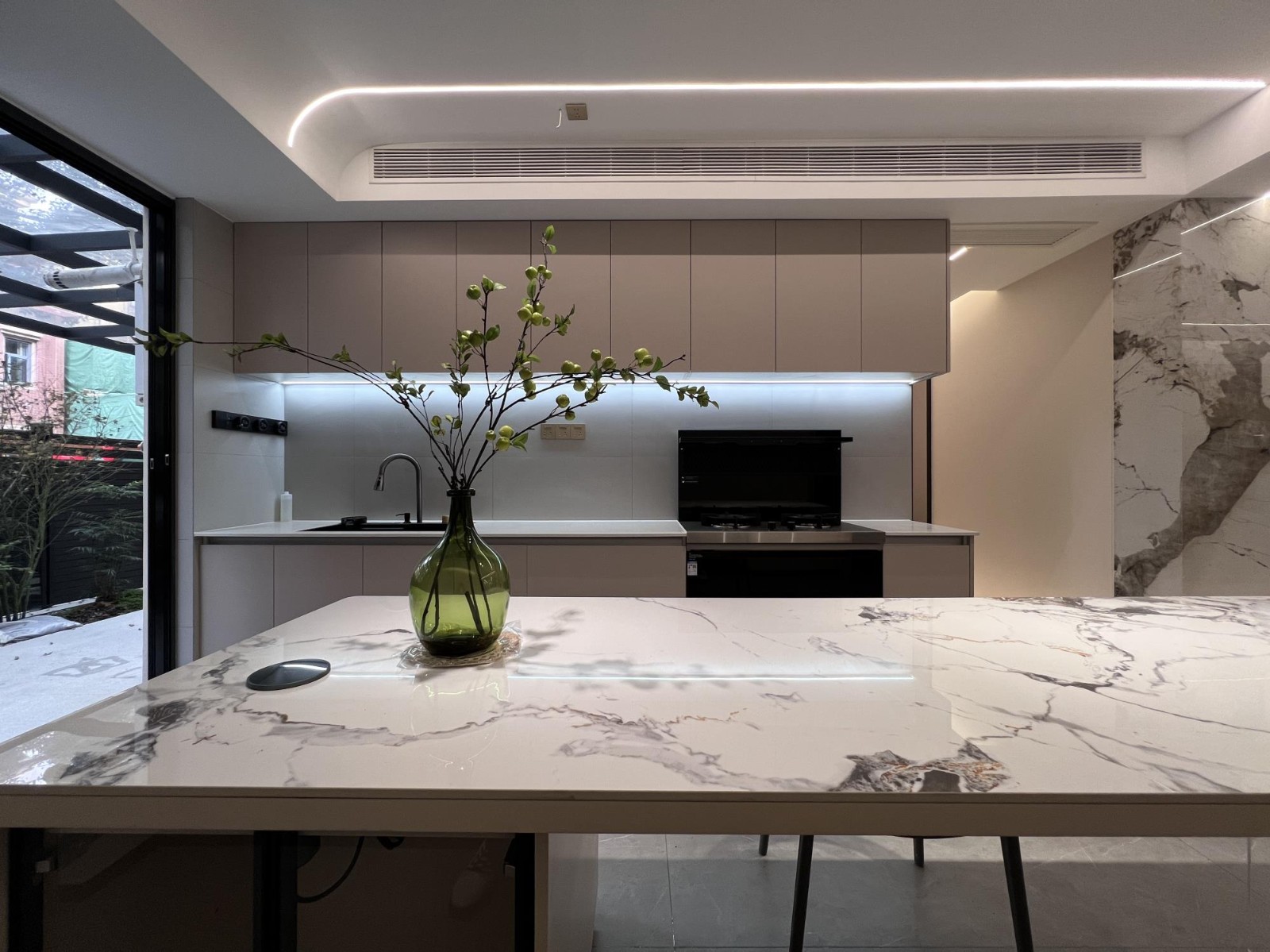 无主灯设计让餐厅和厨房可以根据不同场景和需求调整光线亮度和分布,营造出舒适的氛围。推拉门的设计到达前院,增加了厨房和餐厅的透光性和通风性,同时还可以在里面种菜取材。