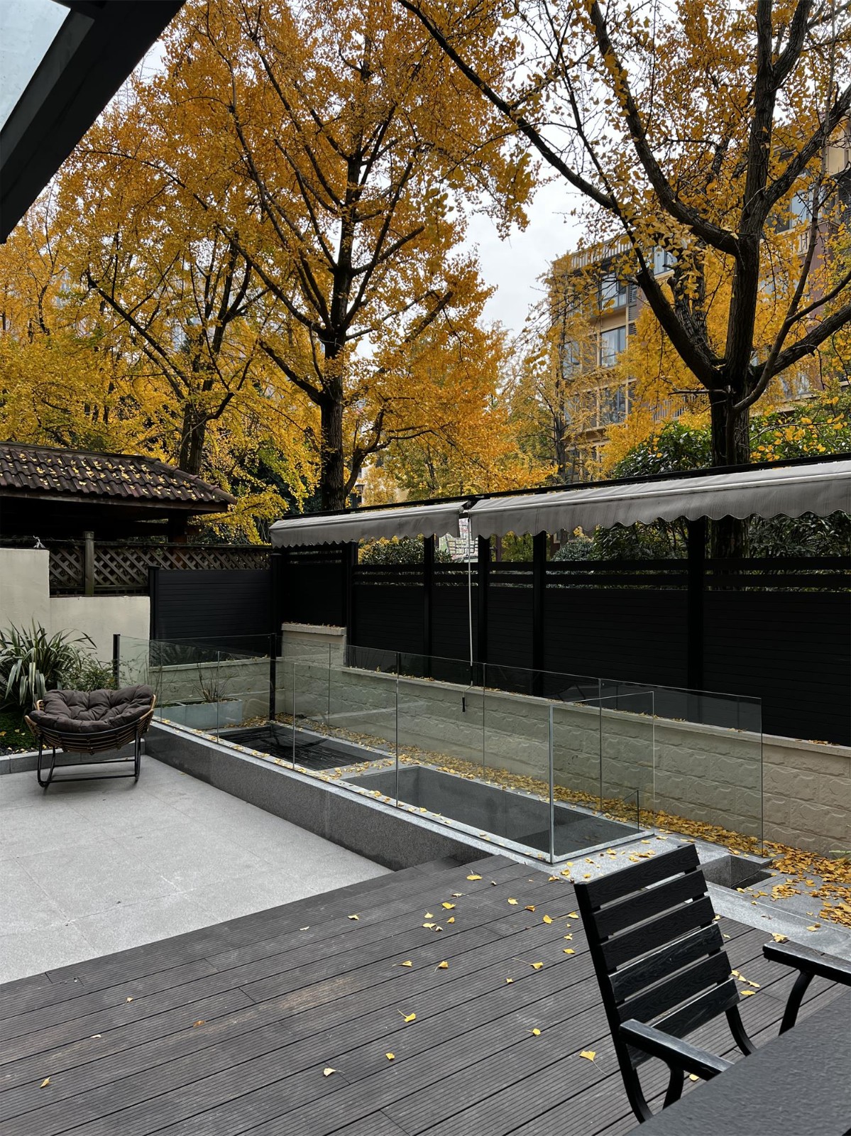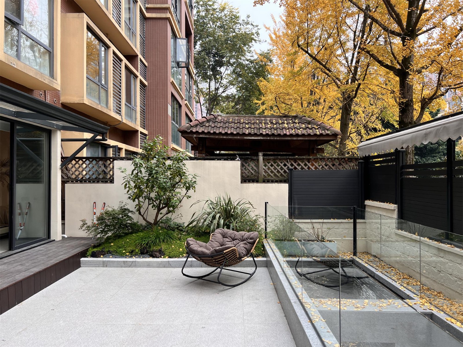 银杏树的高大与庭院内的建筑、家具等形成了鲜明的对比,使庭院内的空间更加有层次感。这种融合让庭院成为了一个宜人的休闲场所,使人身心愉悦,感受到主人的生活品味。