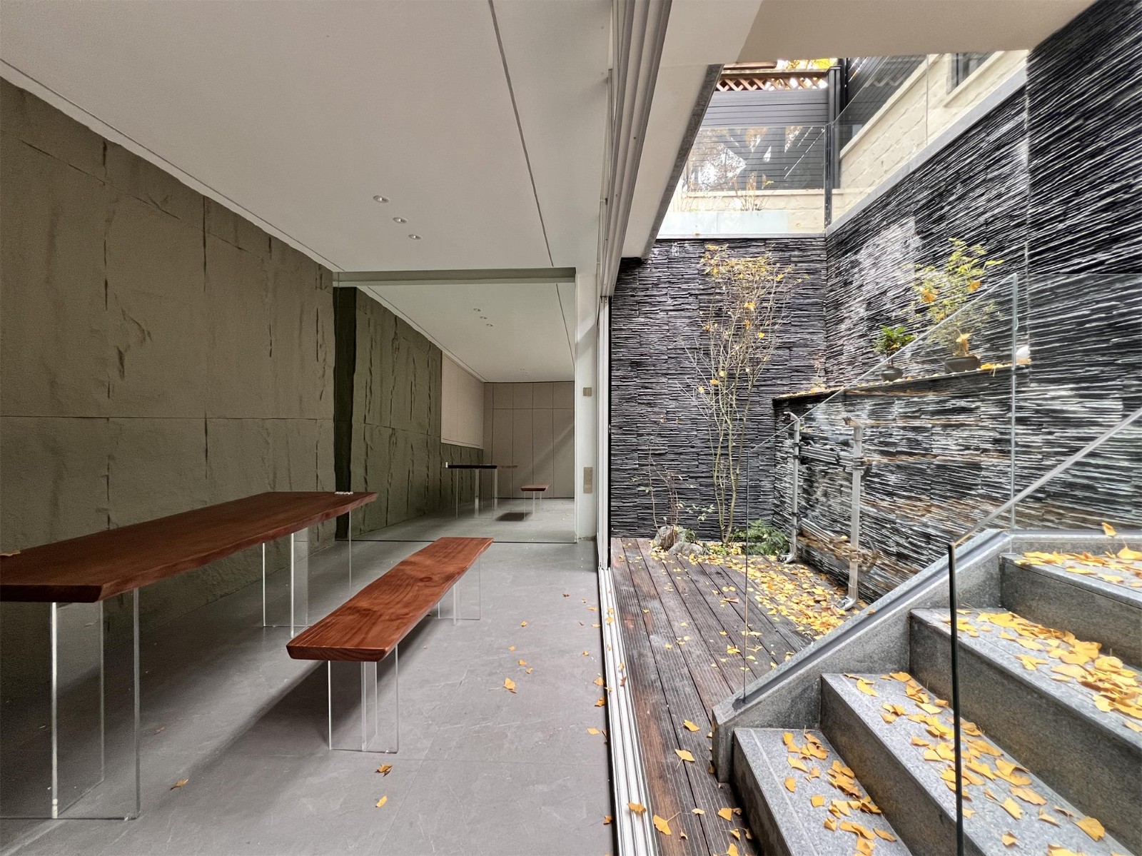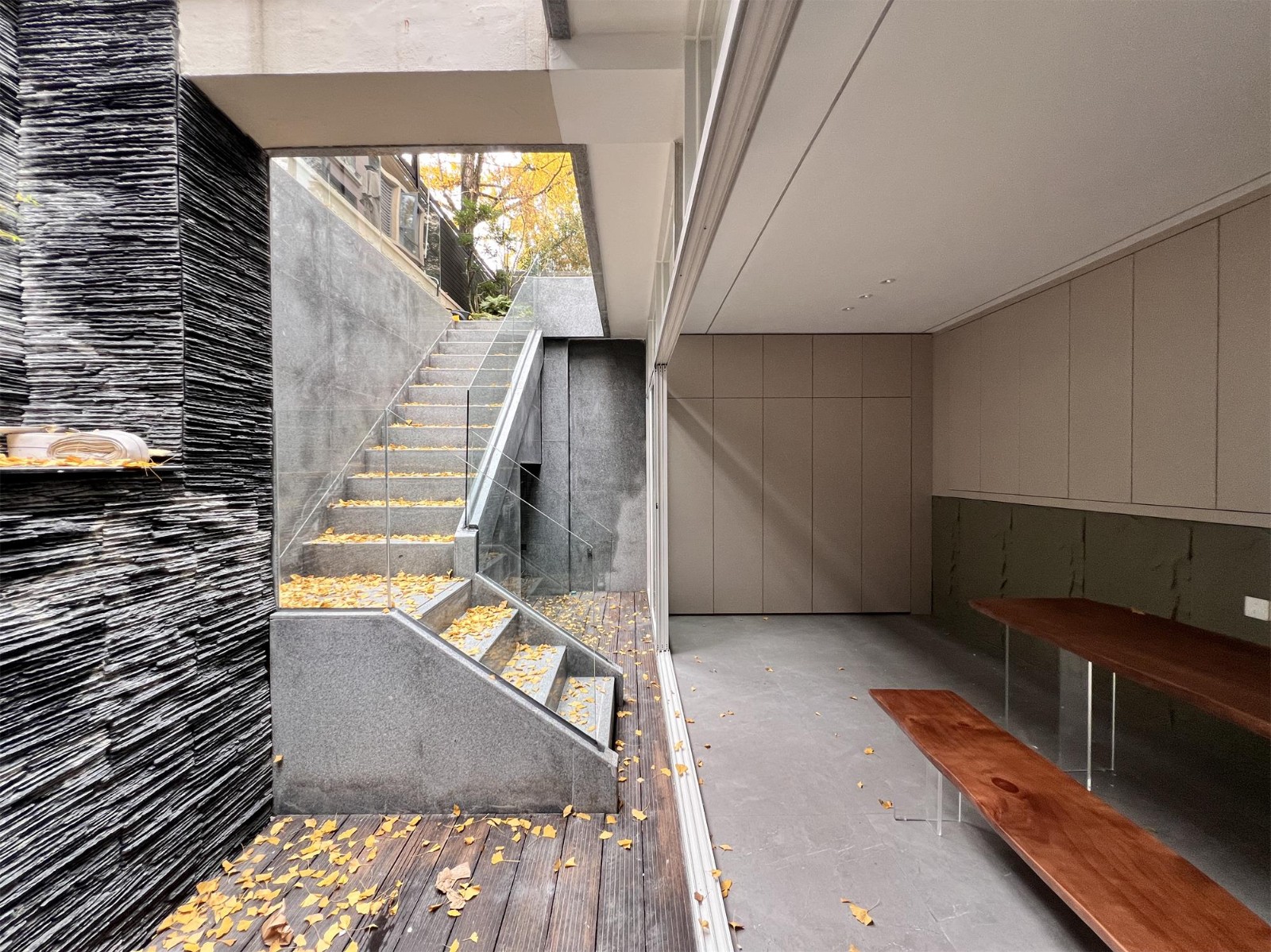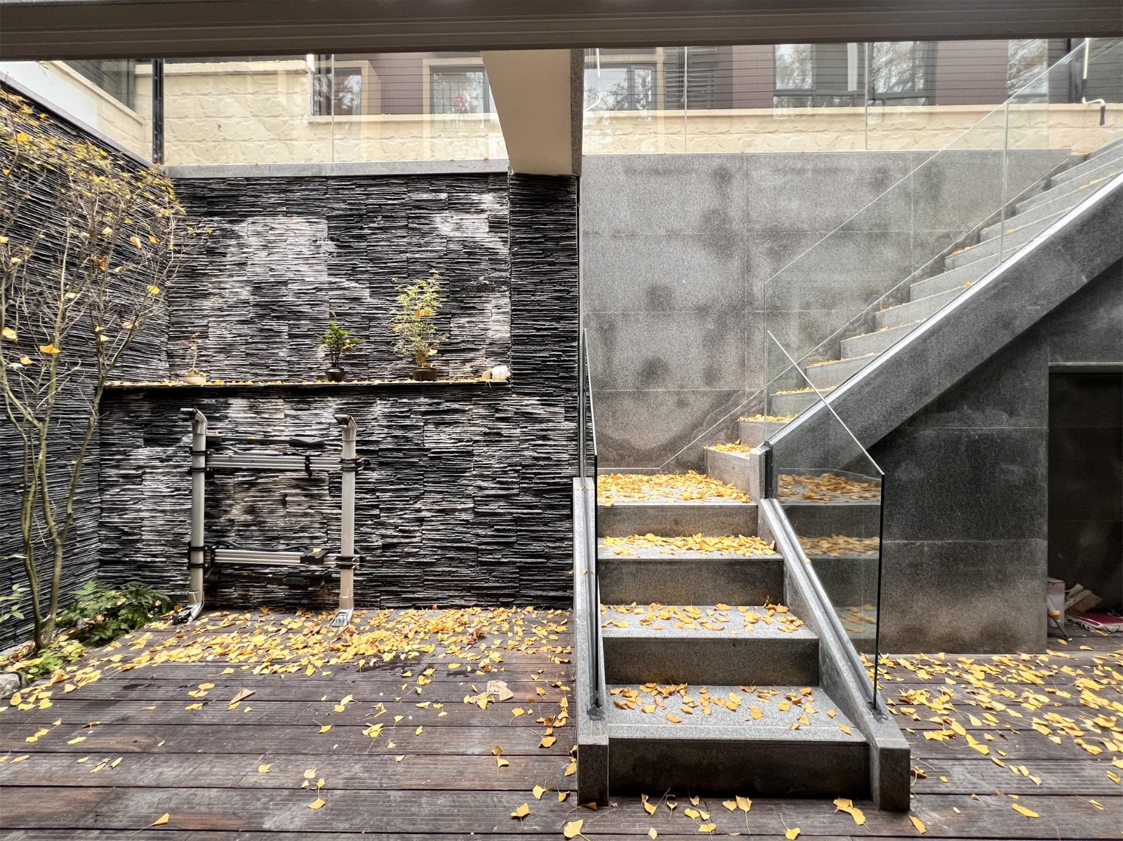 下面的小院充满了生机,植物茂盛,外面银杏叶飘落,金黄的叶片覆盖了地面,营造出温馨宁静的氛围,让人感到舒适和放松。