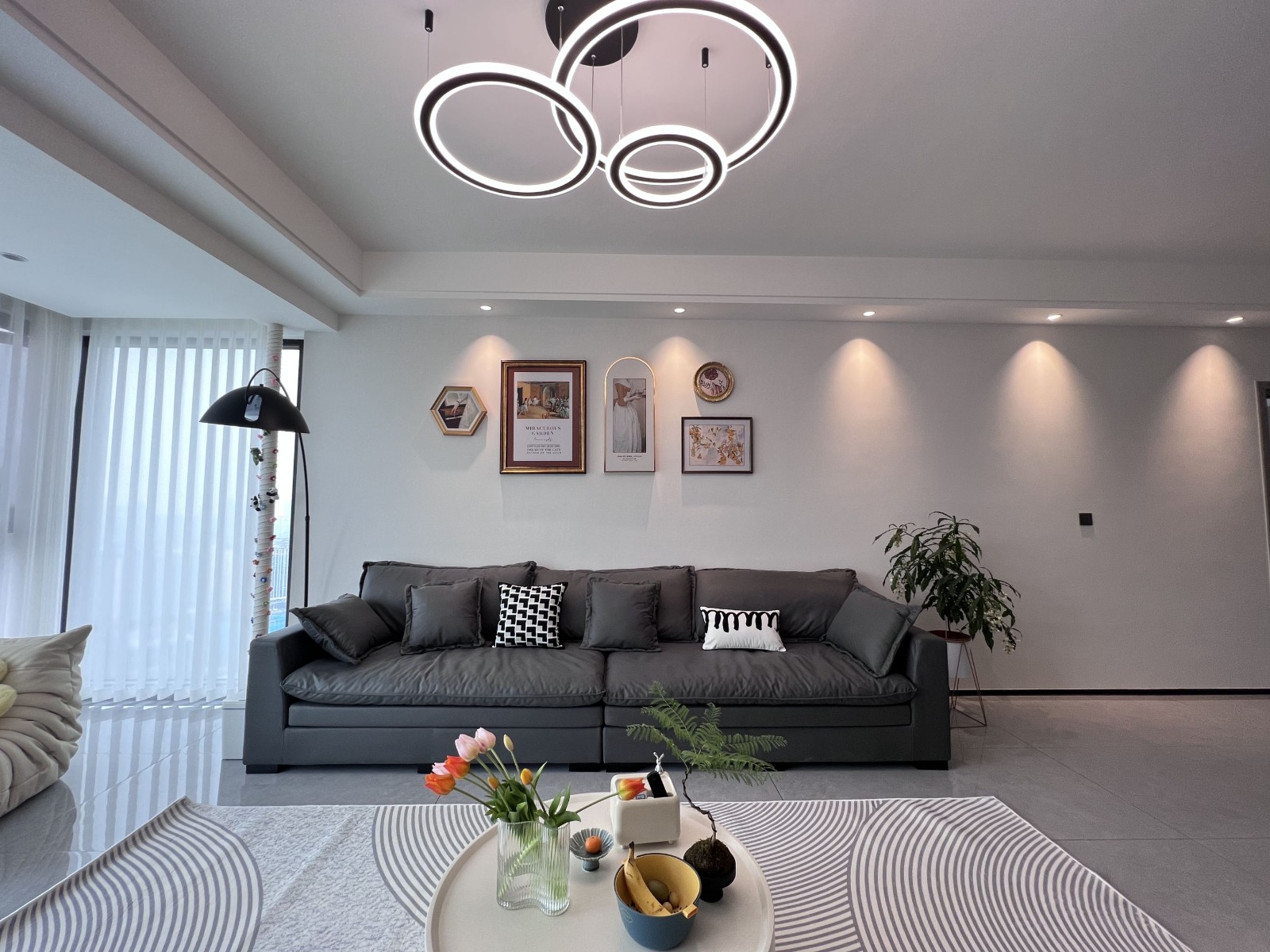 白色圆茶几与深灰色沙发搭配,简约时尚,彰显品味。白色茶几增添客厅的清新感,与深灰色沙发形成和谐对比,营造出舒适宽敞的休闲空间,让人尽情享受宁静的家居生活。