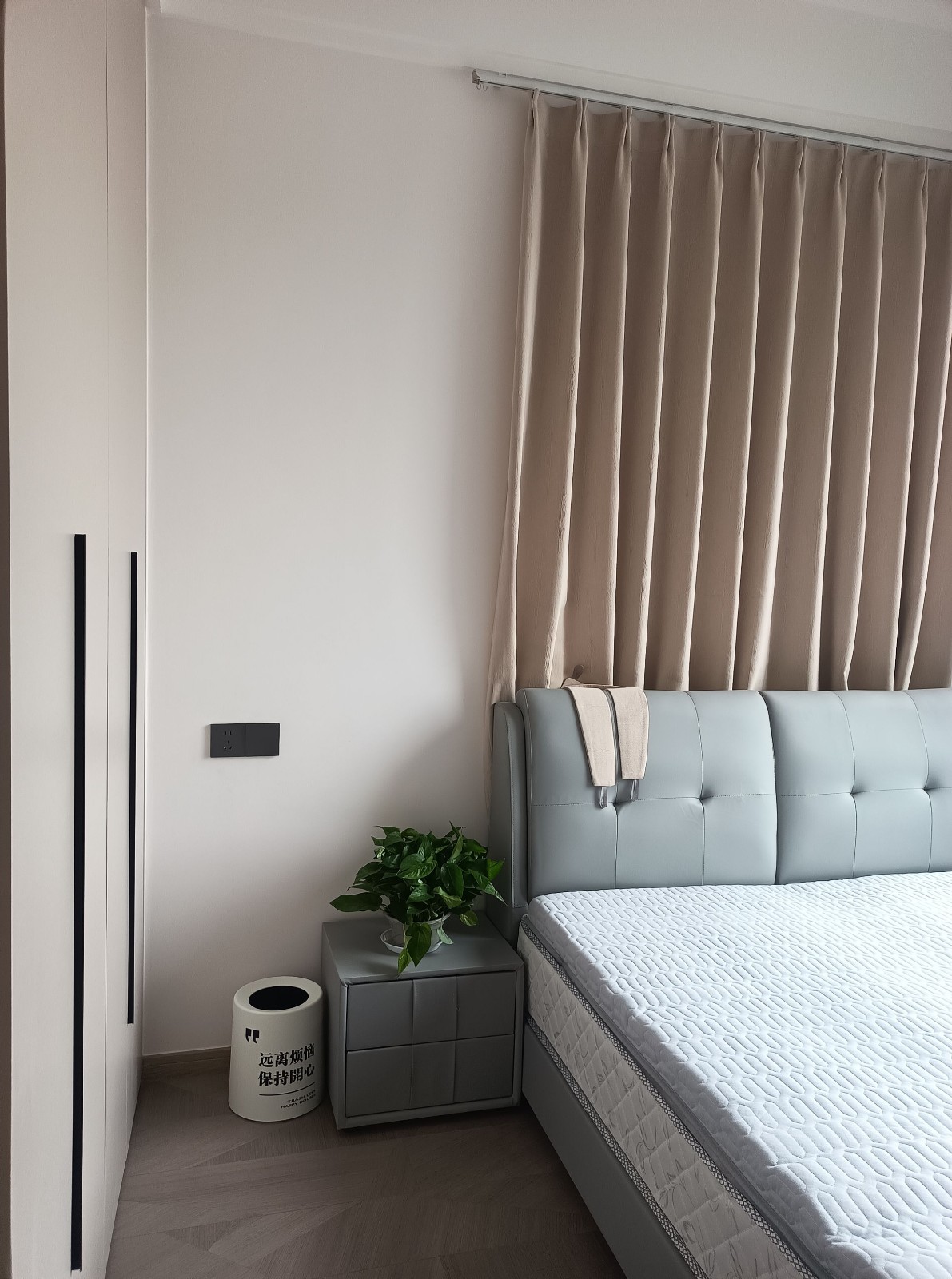 深米白色窗帘搭配浅灰绿色床,营造出优雅而宁静的卧室氛围。深浅搭配的色彩,给人一种温暖而舒适的感觉,让您在疲惫的***后,得以放松身心。