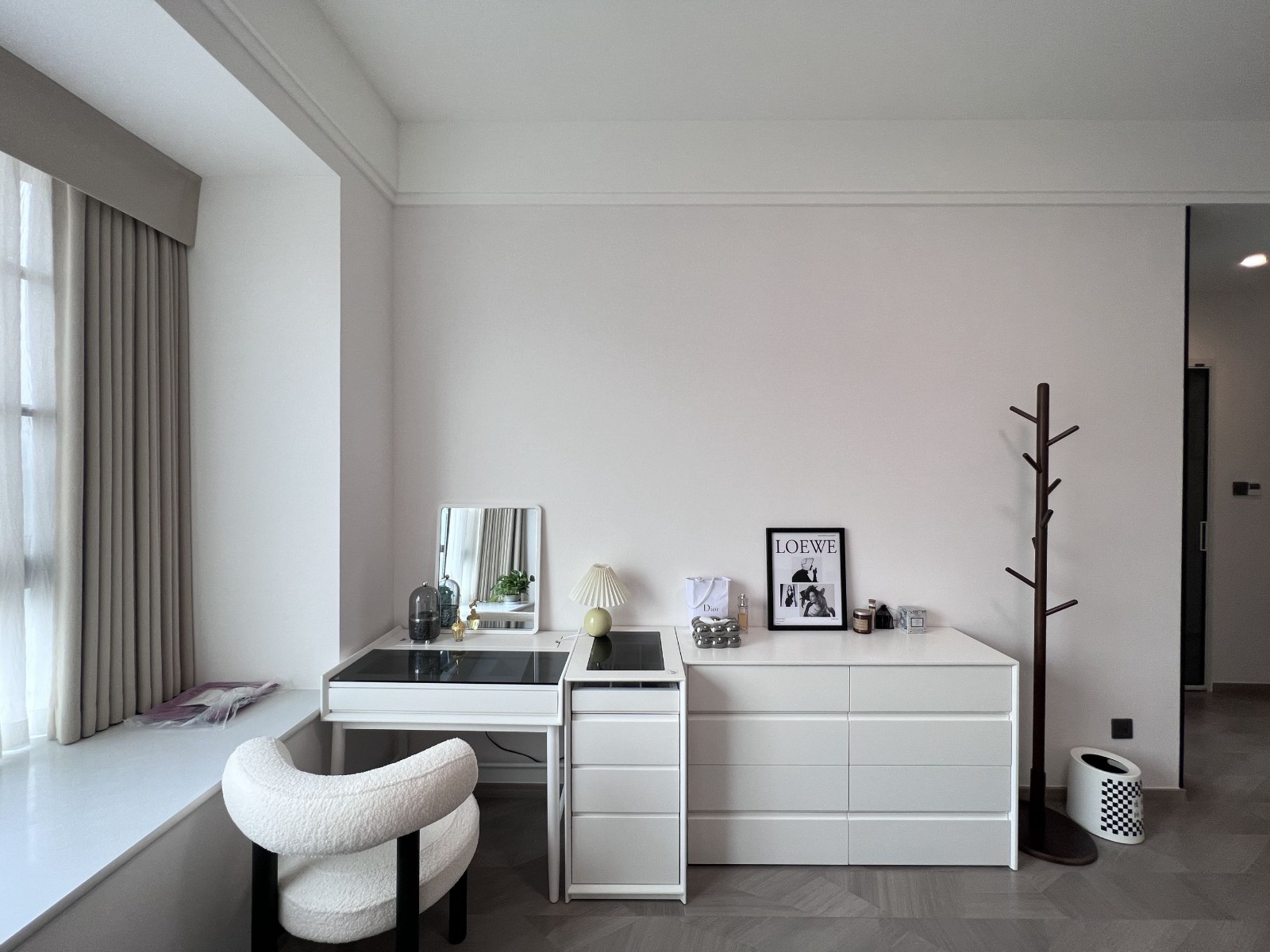 5.白色系收纳柜为主人提供更多储物空间,简约时尚的设计,让卧室环境更加整洁。白色柜子反射光线,使房间更加明亮,带来舒适愉悦的感受。整齐收纳,让生活更加井然有序。
