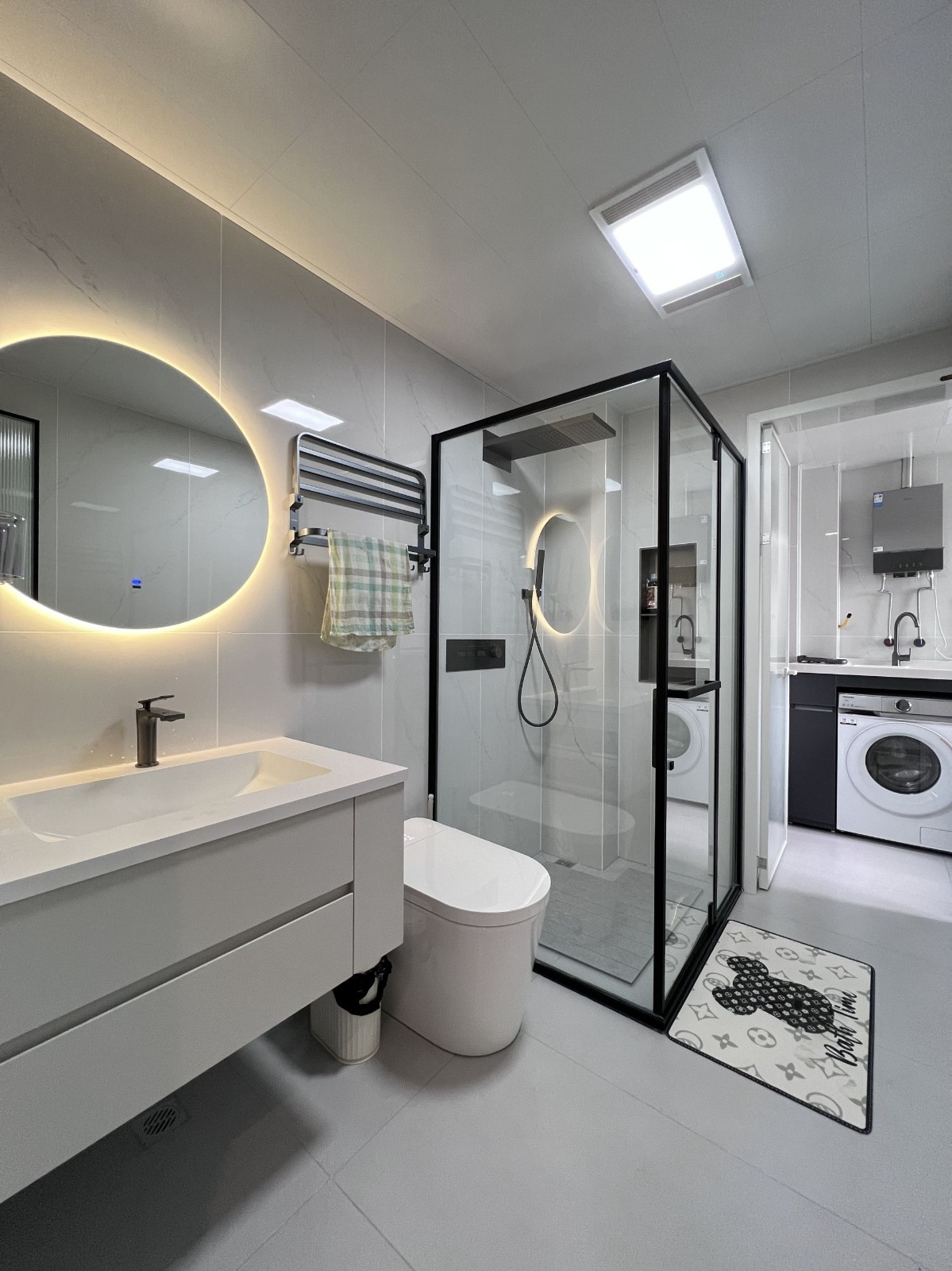 洗衣机镶嵌在洗手台下,洗手池带搓衣板,巧妙利用空间,提供便捷洗护一体解决方案。这样的设计既节省了卫生间空间,又方便了日常生活。洗衣机隐藏在洗手台下,保持整体空间的整洁与美观。洗手池带搓衣板,方便手洗衣物,满足家庭清洁需求。同时,洗衣机和洗手池的上下水管道可以集中处理,降低噪音,保持卫生间干燥。整体设计实用又时尚,为家居生活带来舒适与便捷。