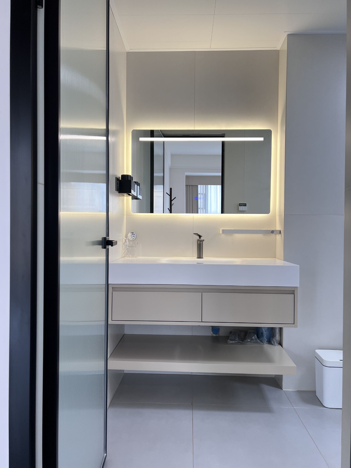 洗手台采用悬空设计,时尚独特,展现现代家居品味。悬空洗手台节省地面空间,便于清洁和维护。底部空气流通,降低潮湿滋生,有利于保持卫生。悬空台面选择防水材质,防止水滴渗透。整体设计简约大方,为家居空间增添一份雅致与舒适。
