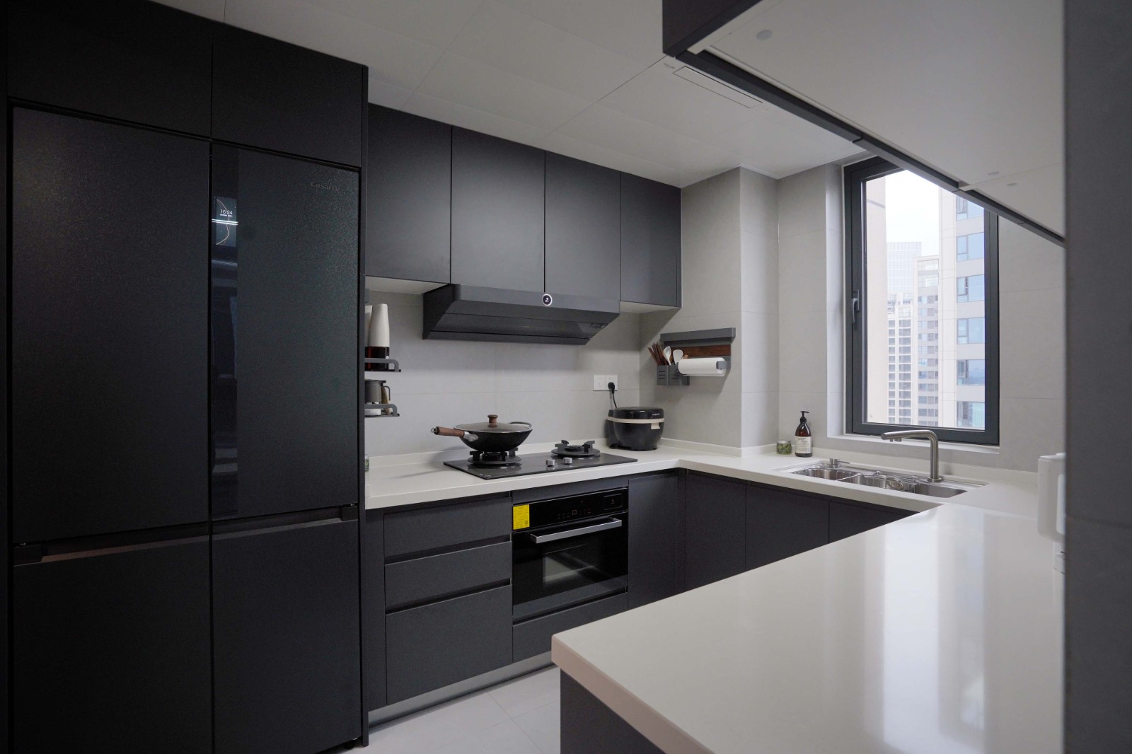 厨房户型方正,在与阳台打通后,我们规划了高效的U型橱柜布局,将洗涤、备餐、烹饪三大功能科学分区,形成了流畅便捷的“黄金三角”操作动线。 空间以经典黑白配色为基调:墙地面通铺亮白色抛光瓷砖,搭配哑光黑色烤漆橱柜。色彩对比鲜明,质感相得益彰,在实现耐看效果的同时也兼顾了易清洁的实用性。 功能设计上,一侧橱柜预留了标准空间将冰箱嵌入,实现视觉上的整洁统一。