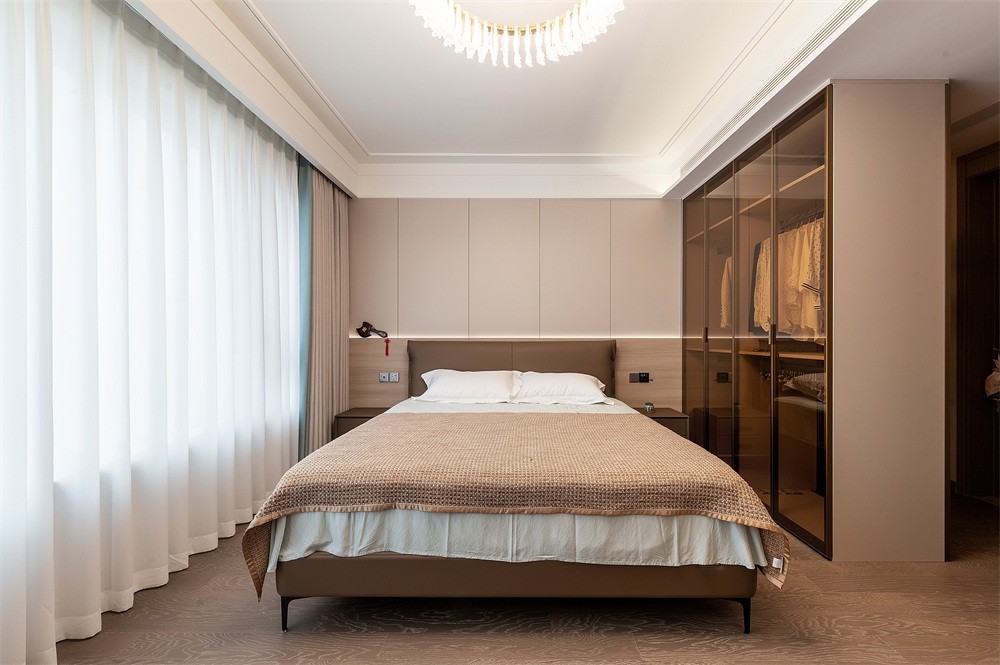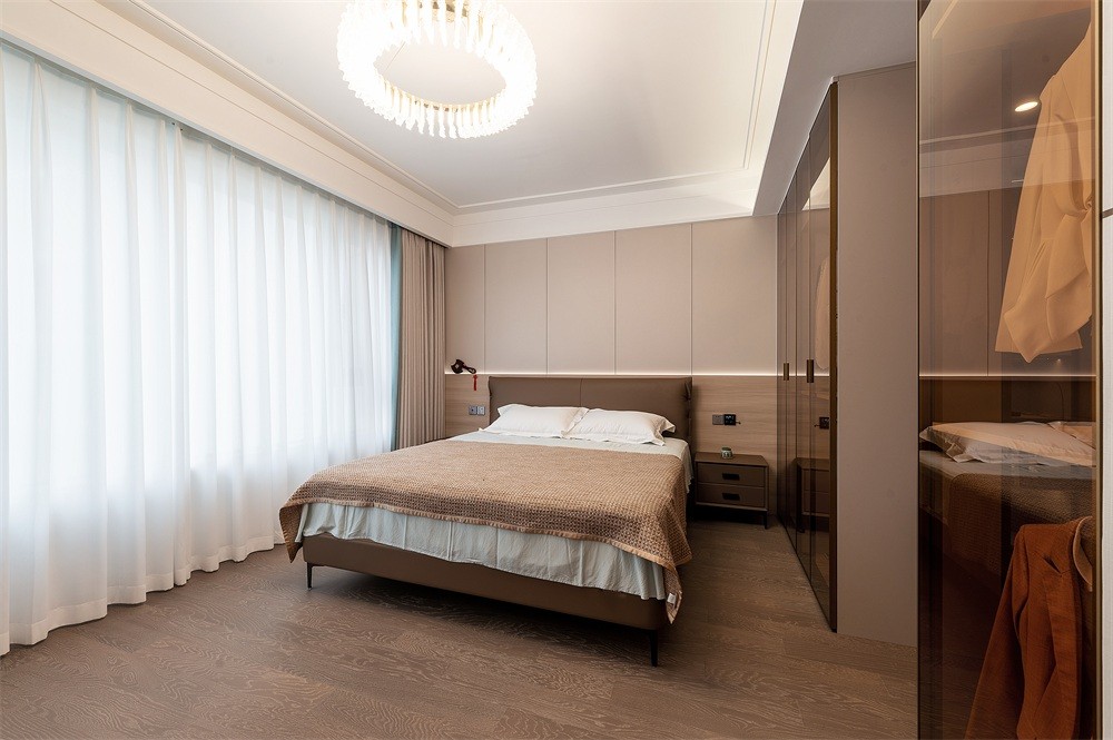 床头背景墙以木饰面与灰色护墙板拼接,形成细腻的视觉层次。中间嵌入隐藏式灯带,成为点睛之笔,烘托出温暖治愈的睡眠氛围。