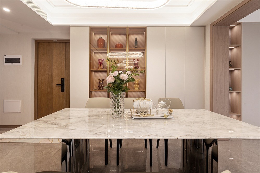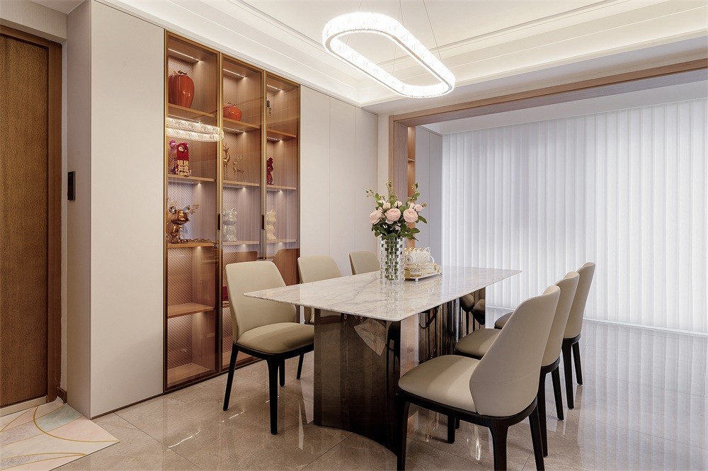 餐厅与阳台打通后,我们在阳台侧边设置了储物柜,与餐边柜完美衔接。顶天立地的定制柜体不仅收纳充足,也避免了积灰困扰。茶褐色玻璃柜门作为视觉焦点,在满足展示性收纳功能的同时,借助材质的对比丰富了空间层次感。