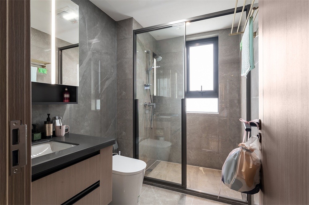 卫生间采用一字型布局,淋浴区以通透钢化玻璃隔断,在实现干湿分离的同时,保持了空间的视觉延伸与通透感。 墙地面通铺***灰色调瓷砖,简约的纹理彰显质感,且易于清洁打理。石膏板吊顶防潮性能优异,流畅的线条勾勒出精致轮廓。 黑棕色实木洗漱台与整体色调呼应,搭配LED智能镜柜,既提升空间照明,也提供充足储物,实现美观与实用的统一。