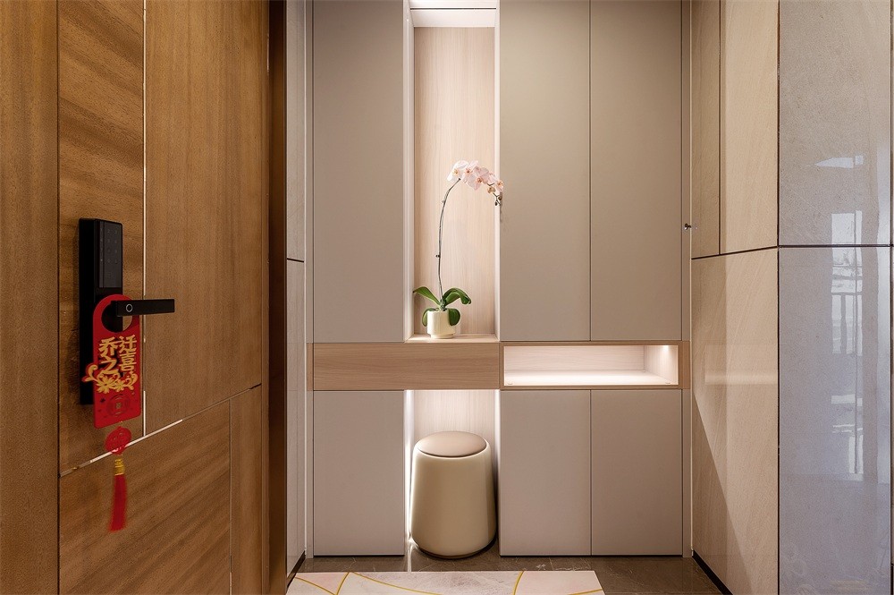 由于户型没有独立玄关,于是在入户门外设置了一组通顶式鞋柜。极简的线条设计,在提供充足收纳空间的同时,也提升了使用的便捷性与整体美感。 柜体中部特意做了留空处理,既方便随手放置小物,也打破了整面柜体的单调感,丰富了立面层次。留空位置内嵌灯带,不仅在夜晚提供柔和照明,也为归家时刻营造出温馨氛围。