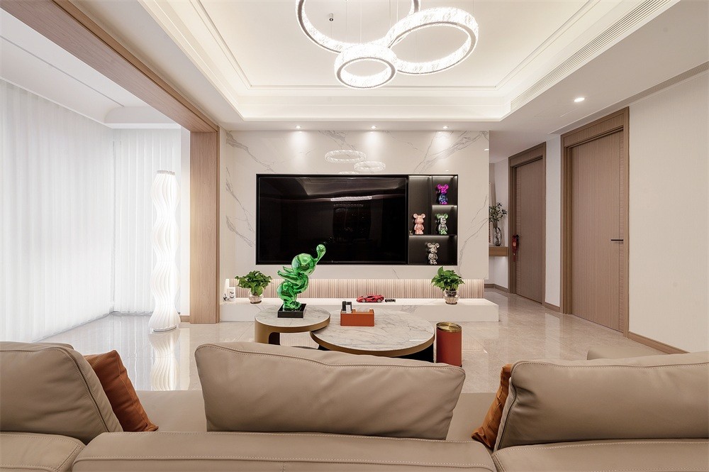 电视背景墙采用悬浮式设计结合地台,通过材质对比与层次叠加,于简约中见精致,诠释现代风格的设计精髓。