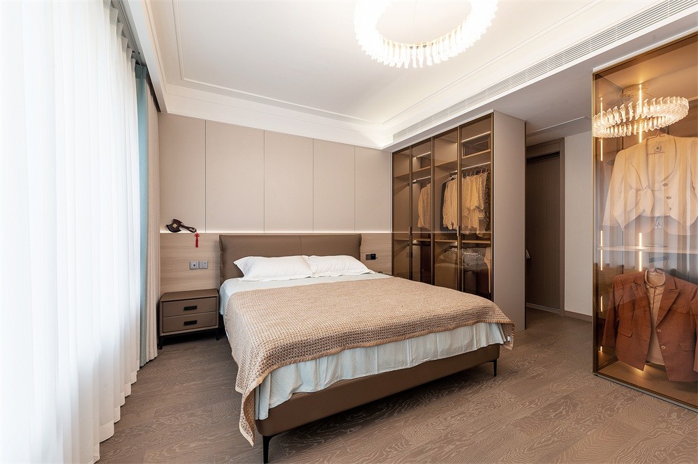 主卧面积宽敞,规划步入式衣帽间,两侧对称布局通顶衣柜。无把手设计兼顾大容量收纳与易打理特性。茶褐色玻璃柜门搭配嵌入式灯带,在展现***质感的同时,也以交错光影为空间注入优雅艺术气息,营造温暖静谧的休憩环境。