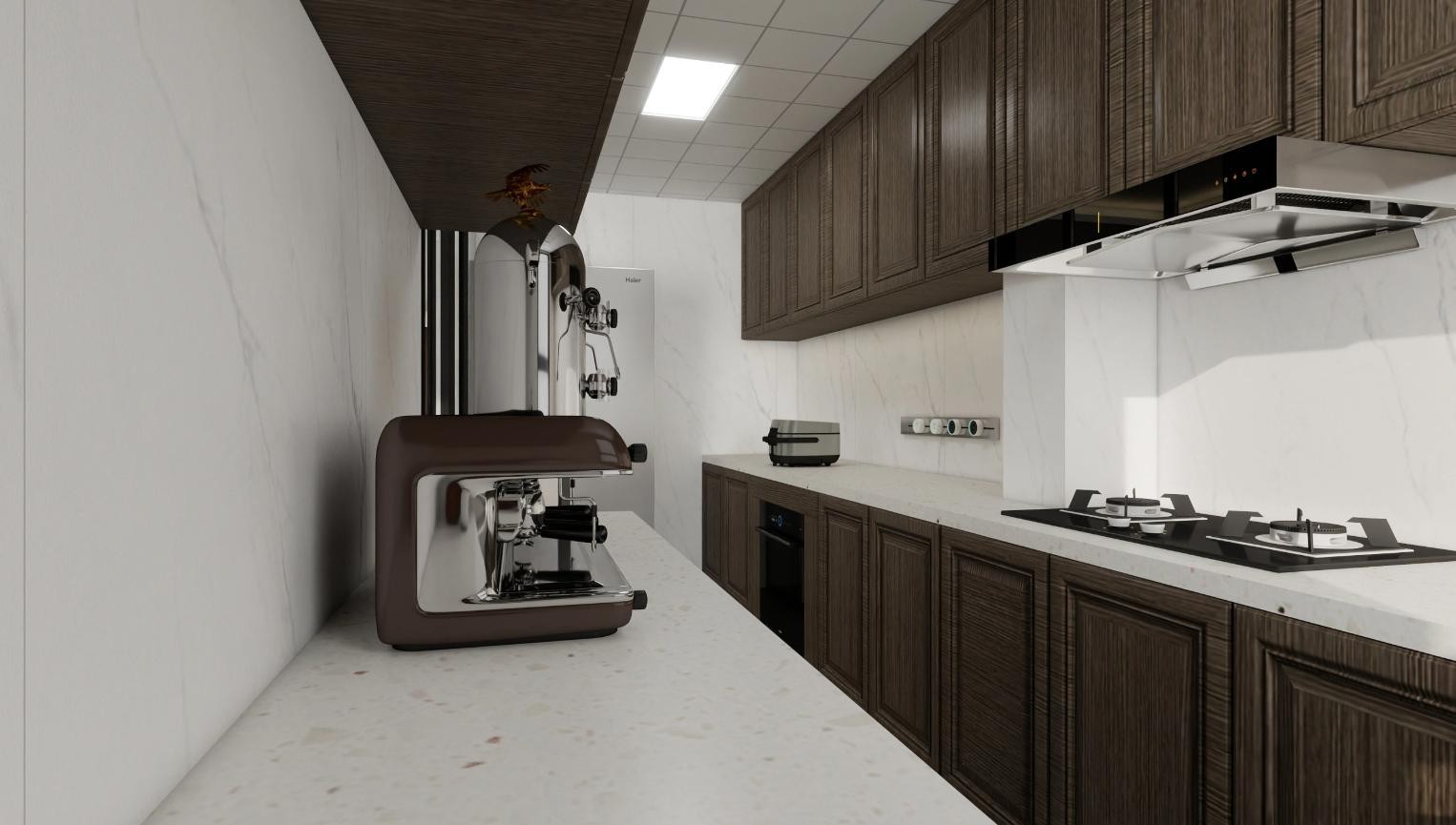 木纹质感的橱柜爱了爱了,搭配上户主同系列咖啡机,不爱做饭的人也可以在厨房多呆一会。